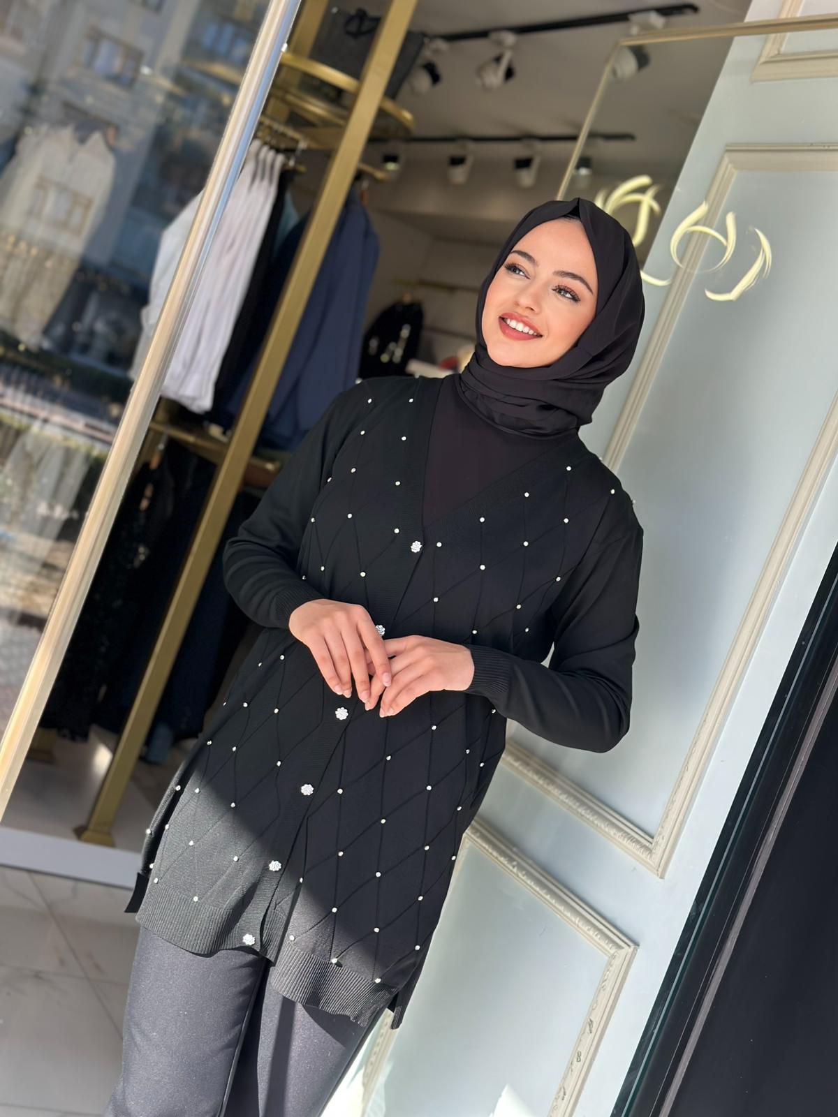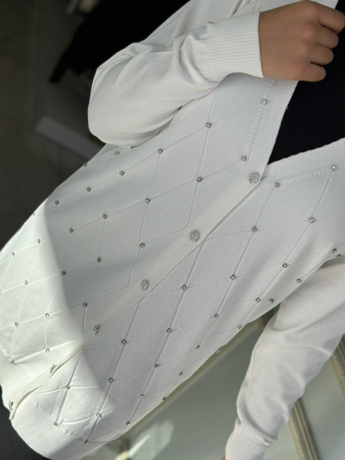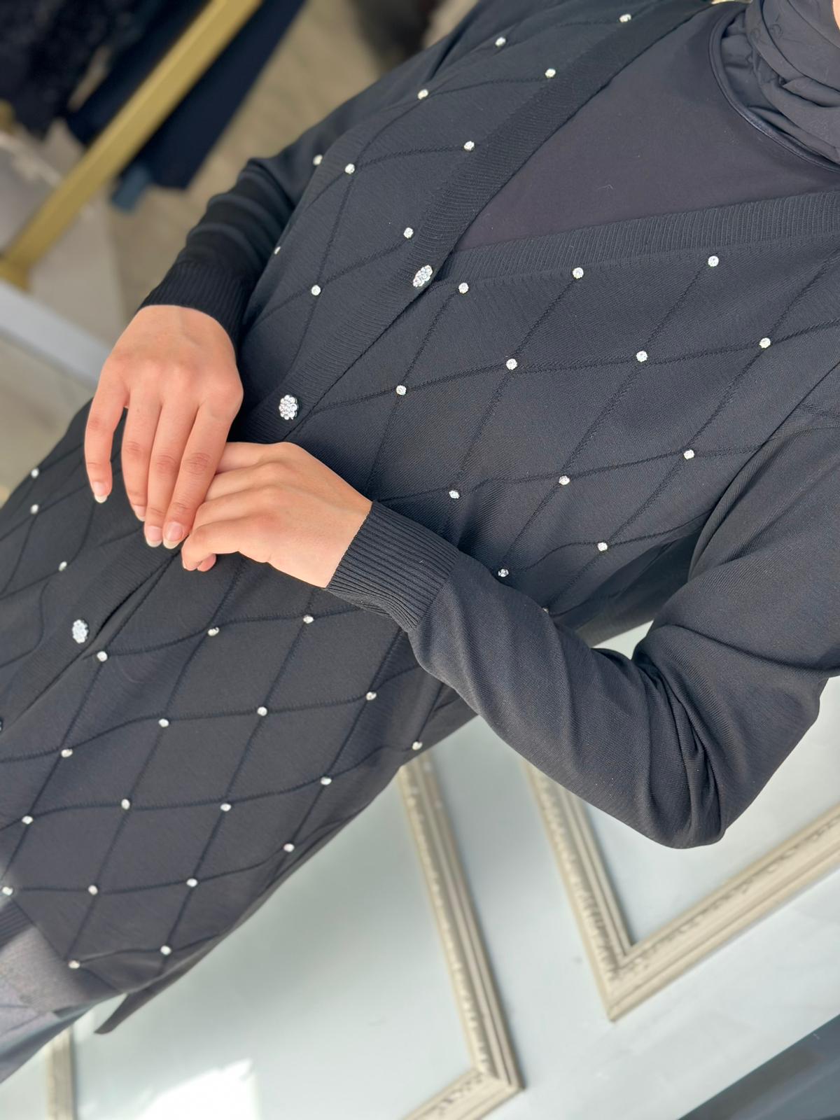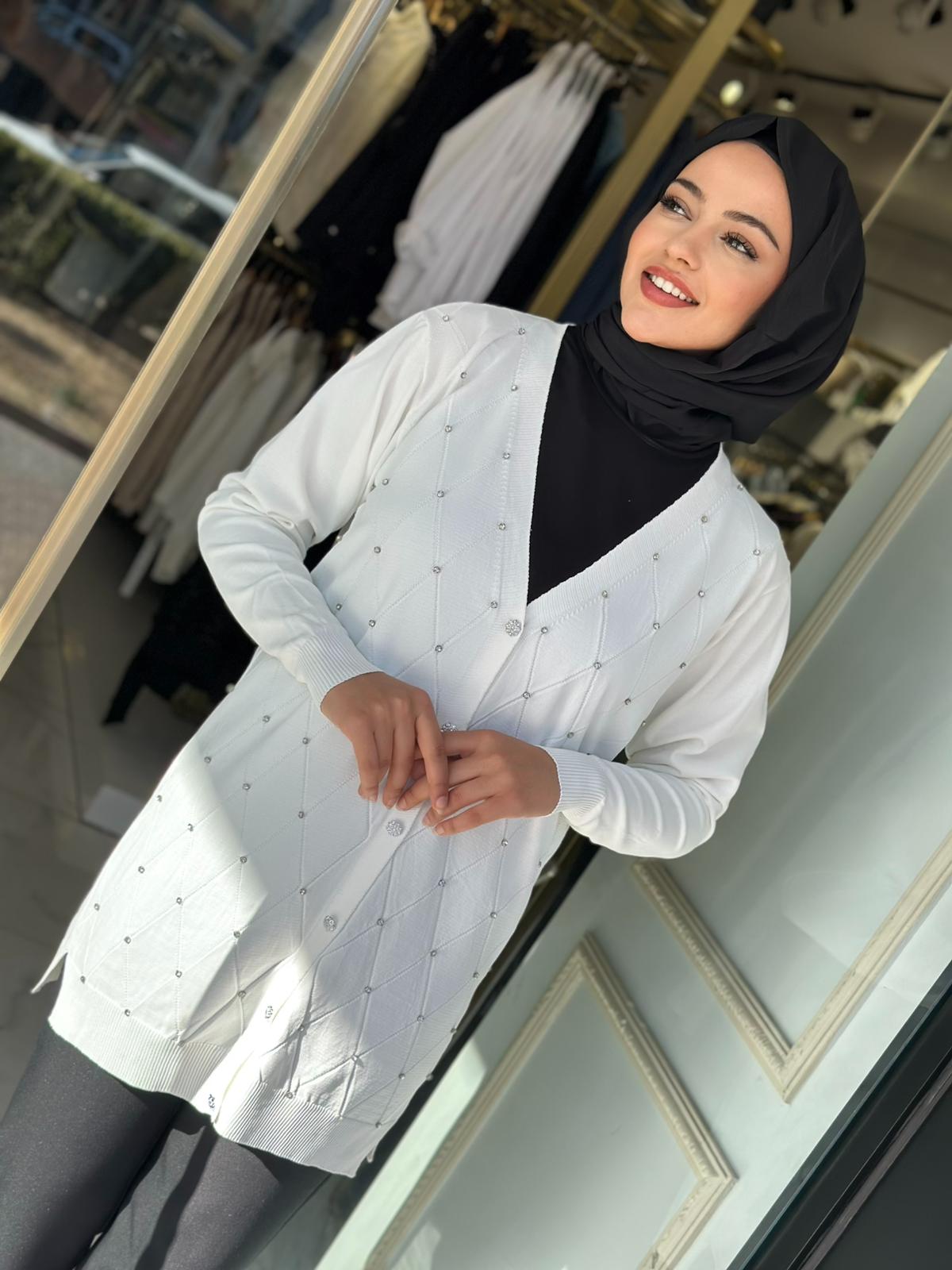 Baklava Desen Taşlı Triko – Beyaz / Siyah / Bordo Renkleri ve Standart Beden olup, 36/38/40/42/44 Bedenlere uyumludur. 85cm Boy uzunluğu vardır.