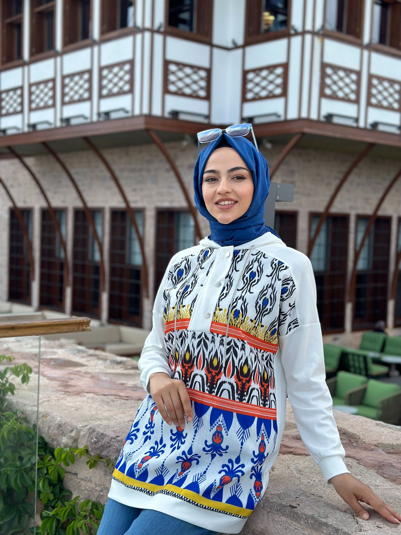 Beyaz Desenli Tunik, 38/40/42/44 bedenleri mevcuttur. 90cm boy uzunluğu vardır.