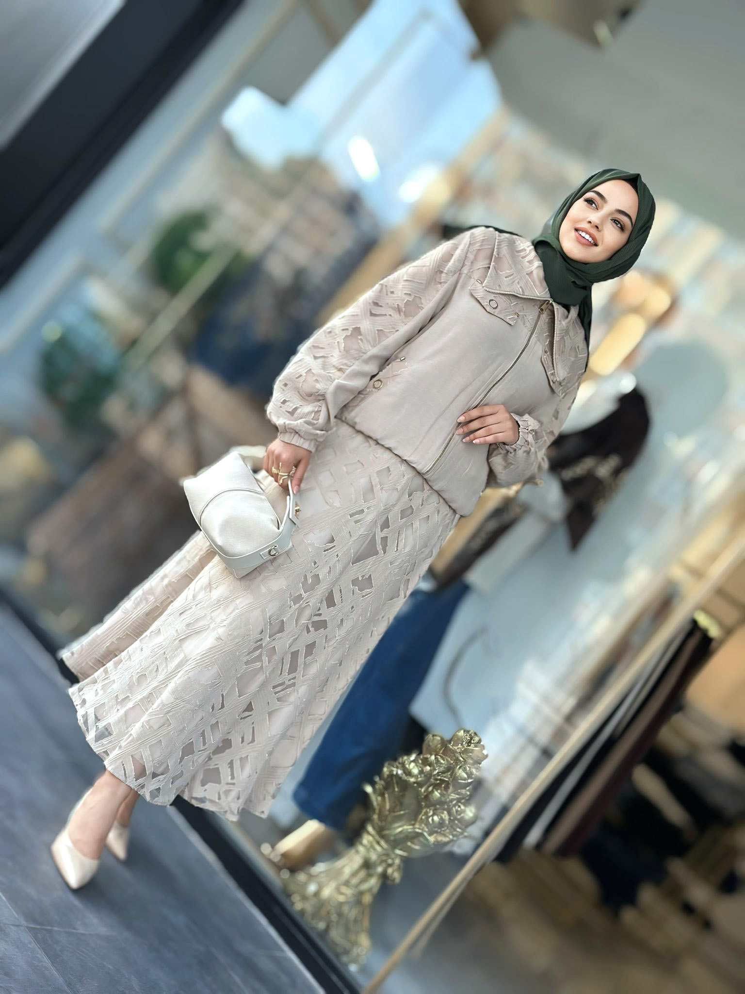 Dokulu Desenli Etekli İkili Takım Bej, 38/40/42/44 Bedenleri mevcuttur. Rahat Kalıptır. Etek Beli Lastiklidir.