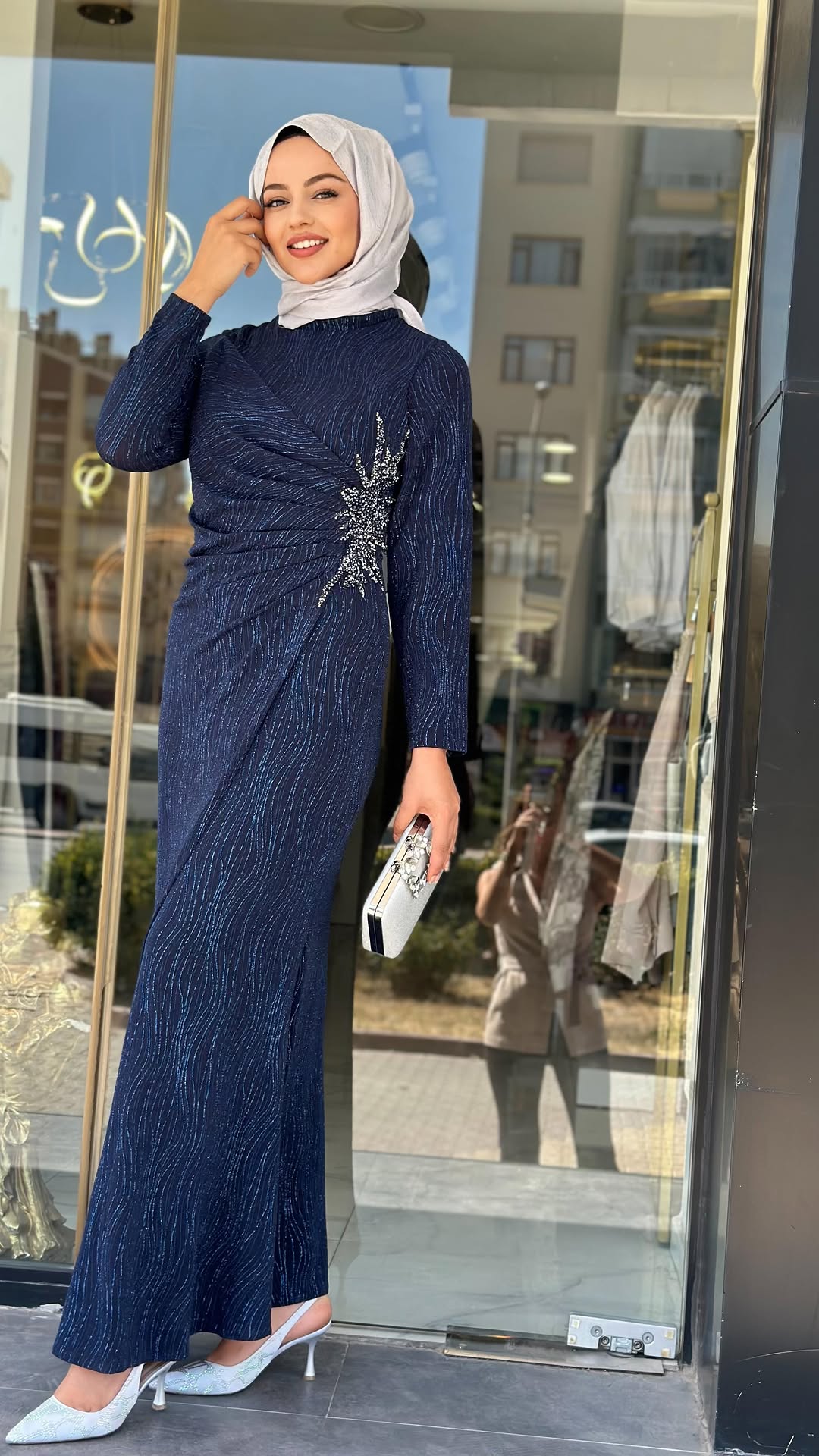 Drapeli Abiye – Siyah / Lacivert Renkleri ve 38/40/42/44 Bedenleri mevcuttur. 150cm Boy uzunluğu vardır.