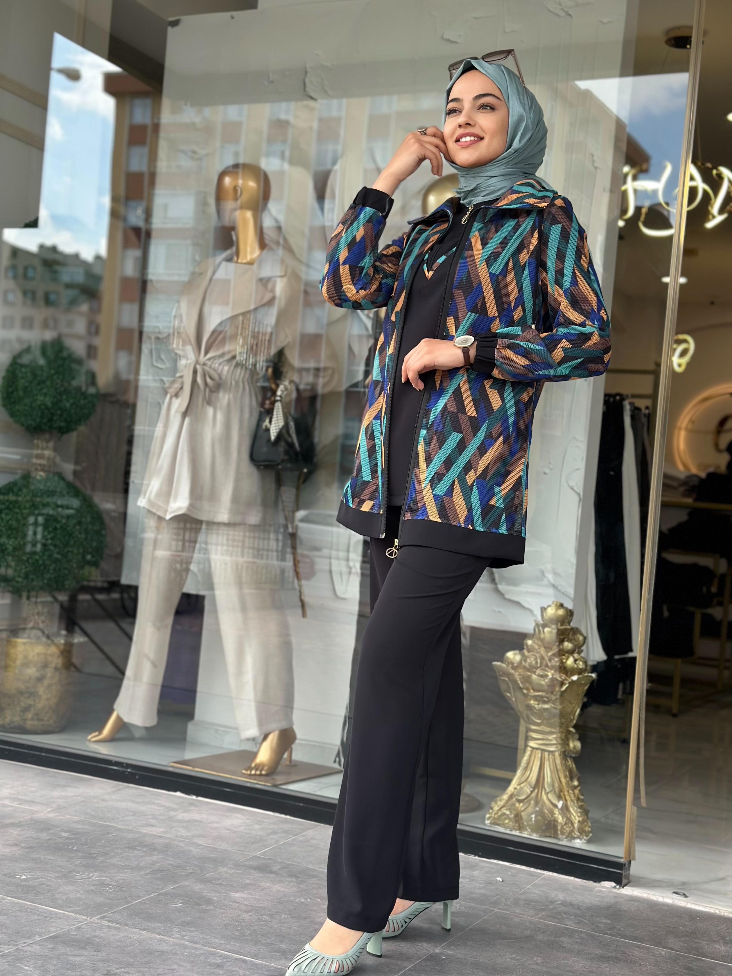 File Ceket Üçlü Takım Siyah, 38/40/42/44/46/48 Bedenleri mevcuttur. 70cm Krep Kumaş İç Tunik, 75cm Ceket. Pantolon Beli Lastiklidir.