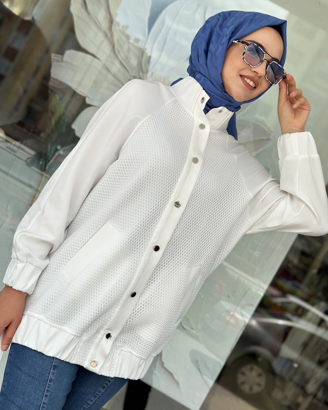 File Detay Beyaz Bomber Ceket, Standart Beden Olup 38-44 Beden aralığına uyumludur. 77cm boy uzunluğu vardır.