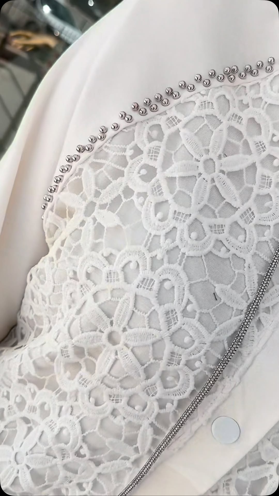 Güpür Ceketli İkili Takım Beyaz, S-M(38-40) , L-XL (42-44) Bedenleri mevcuttur. 80cm Ceket Boyu vardır.
