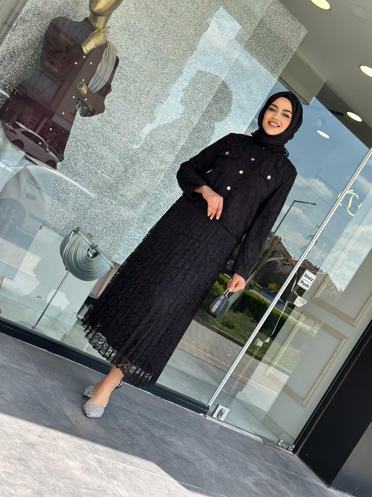 Güpür Etekli Takım – Siyah / Kahve Renkleri ve 36/38/40/42/44 Bedenleri mevcuttur. Etek Yandan Fermuarlı olup 90cm Boyu vardır. Üst Gömlek 52cm Boyu vardır.