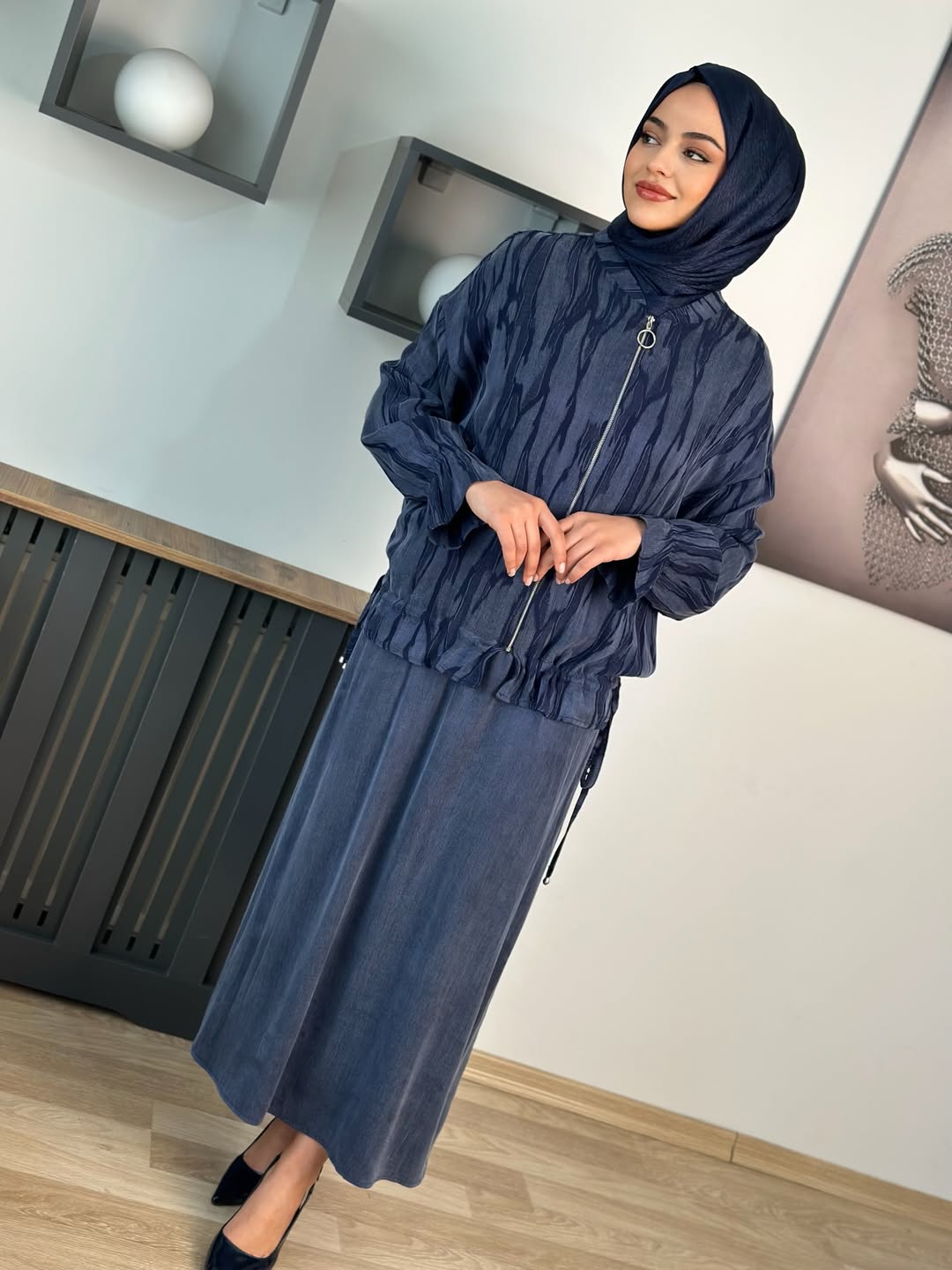 İpek Qupra Ceketli Elbise Indigo, 42/44/46/48/50 Bedenleri mevcuttur. İç Elbise Kolsuzdur, Ceket Boyu 70cm‘dir.