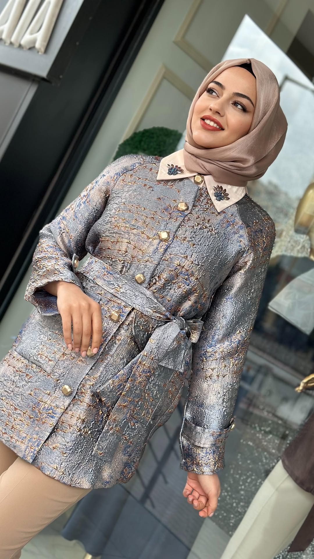 Jakarlı Ceket Mavi Bakır Desenli, S (38-40) / M (42) / L (44) Bedenleri mevcuttur, 85cm Boy Uzunluğu vardır.
