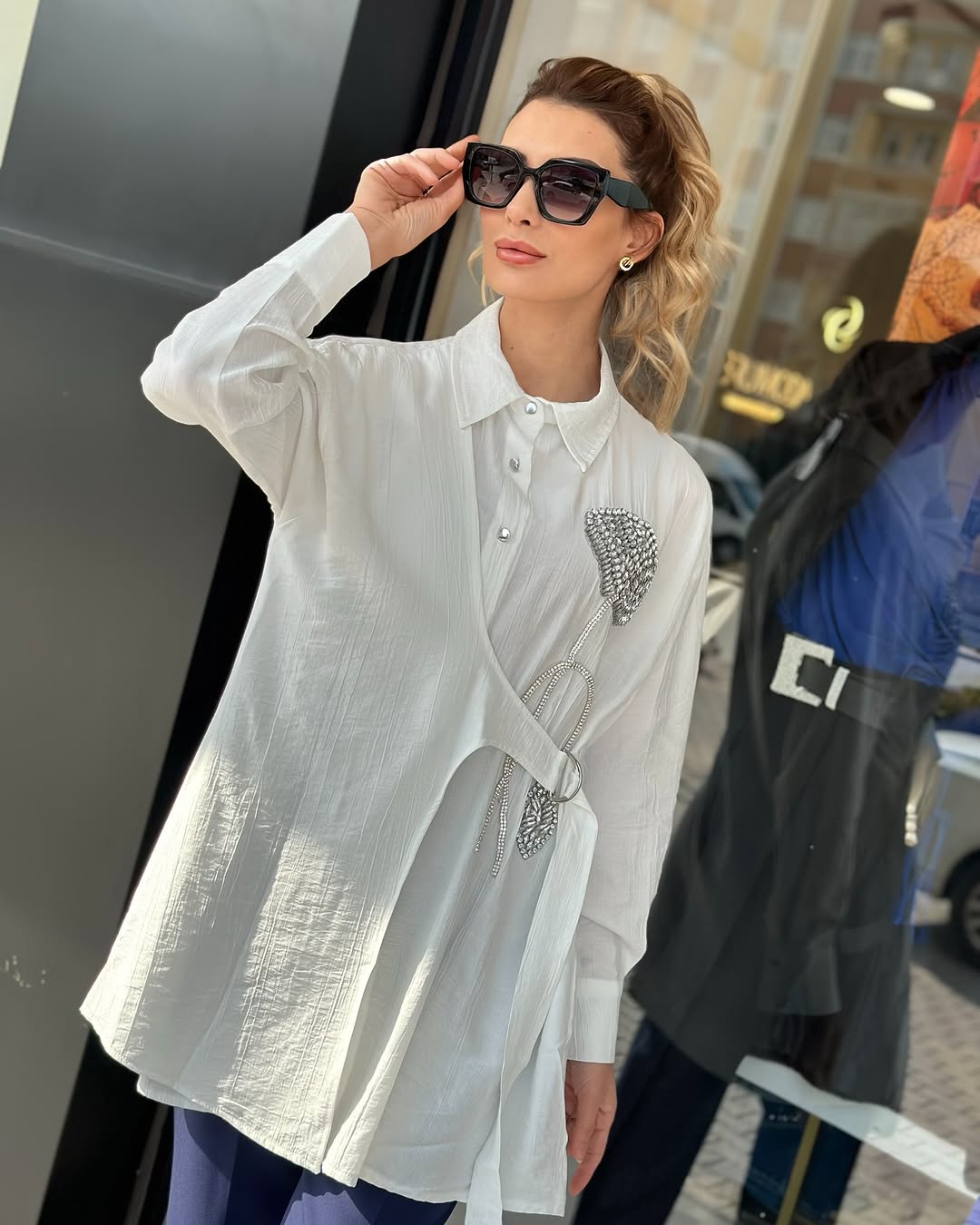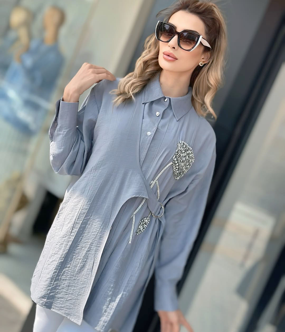 Kemerli Çilek Kumaş Taşlı Gömlek – Yeşil / Beyaz / Siyah / Gri Renkleri olup, S-M(38-40), L-XL(42-44) Bedenleri mevcuttur. 80cm boy uzunluğu vardır.