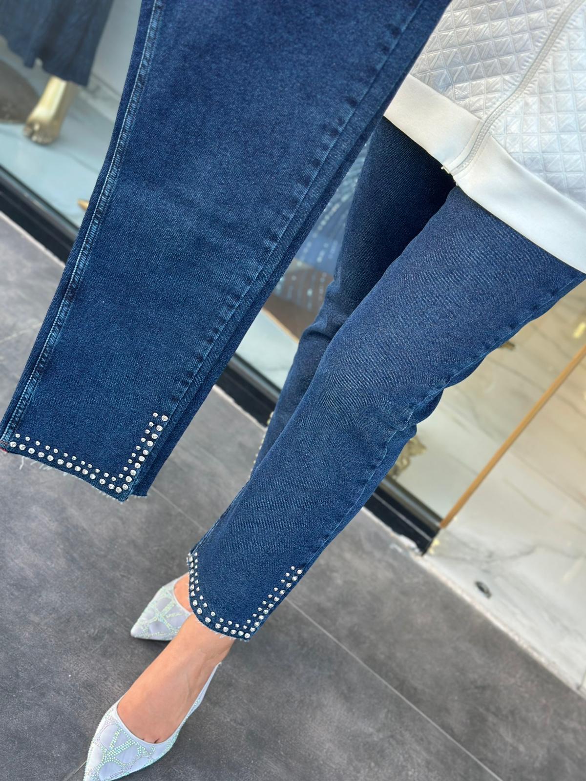 Kesik Paça Taşlı Full Likra Mom Jean – Beyaz / Lacivert Renkleri ve 28 (36-38), 30 (40), 31(40-42), 32 (42), 33(44) Bedenleri mevcuttur. 95cm Boy uzunluğu vardır.