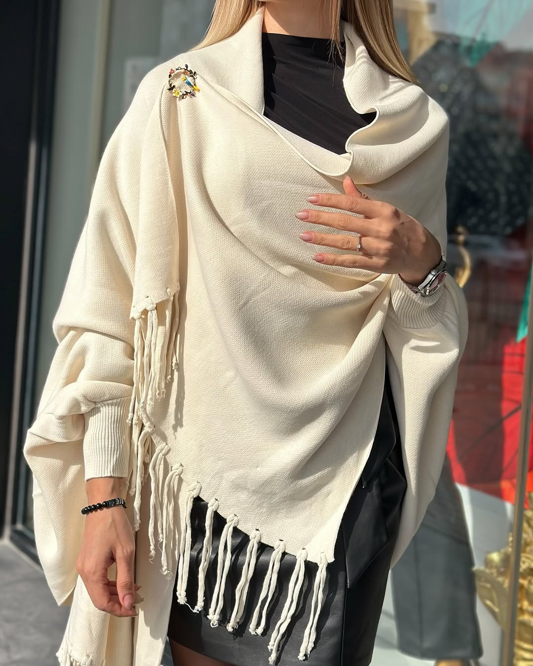 Kollu Triko Şal Siyah / Ekru Renkleri olup, Standart Bedendir.