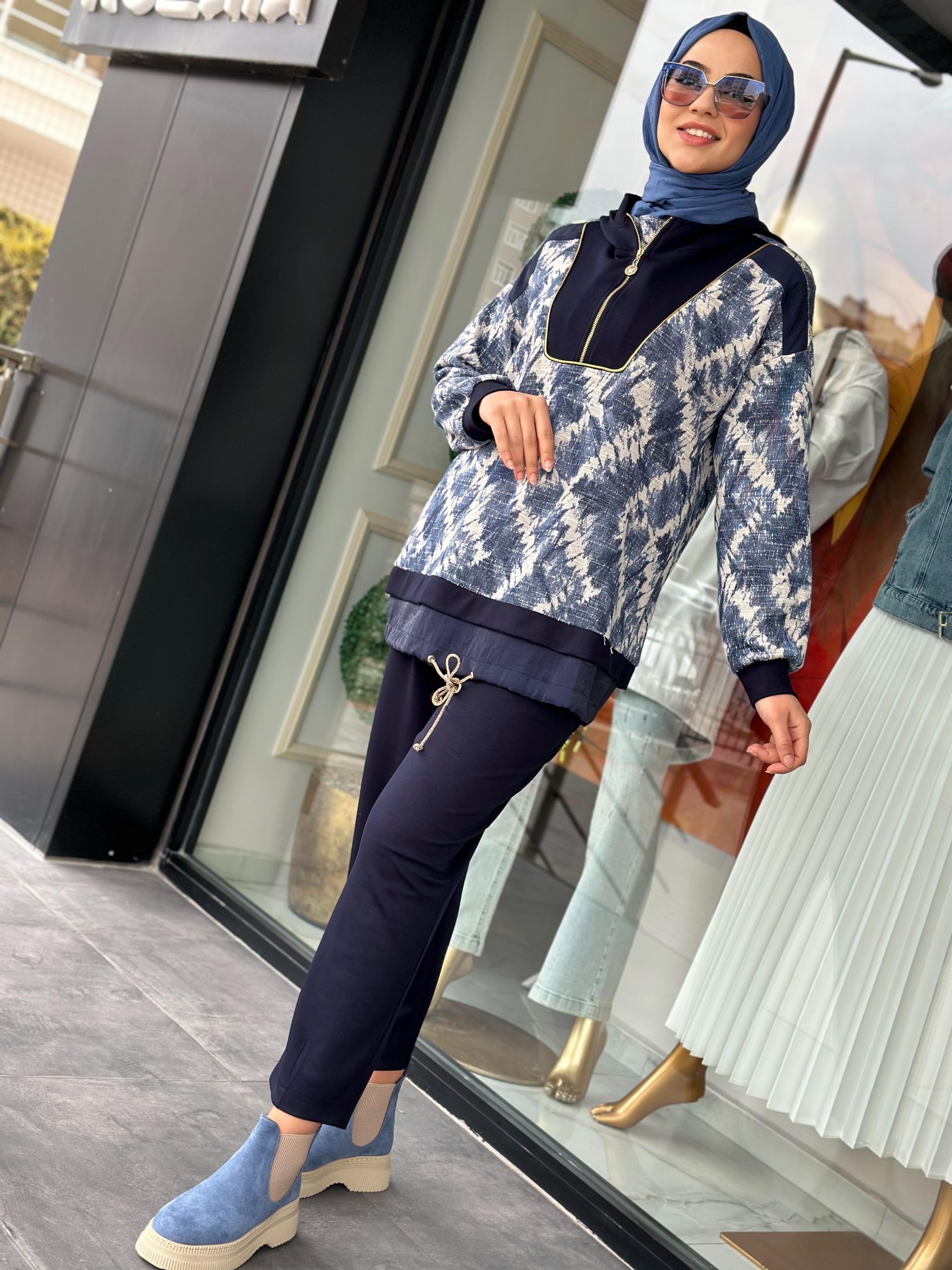 Lacivert Desenli İkili Takım, 1 Beden(38-40), 2 Beden(42-44) bedenleri mevcuttur. Tunik Boyu 80cm, Pantolon Boyu 95cm.