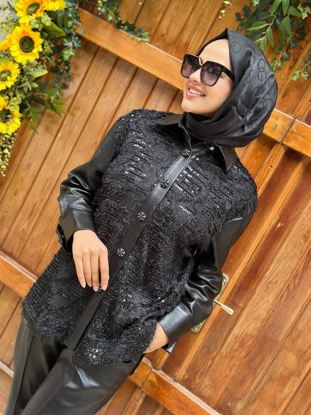 Laklı Önü Sakallı İkili Takım Siyah, 1 Beden(38/40) 2 Beden(42/44) Bedenleri mevcuttur. Gömlek Boyu 75cm, Pantolon Beli Yarı Lastiklidir.