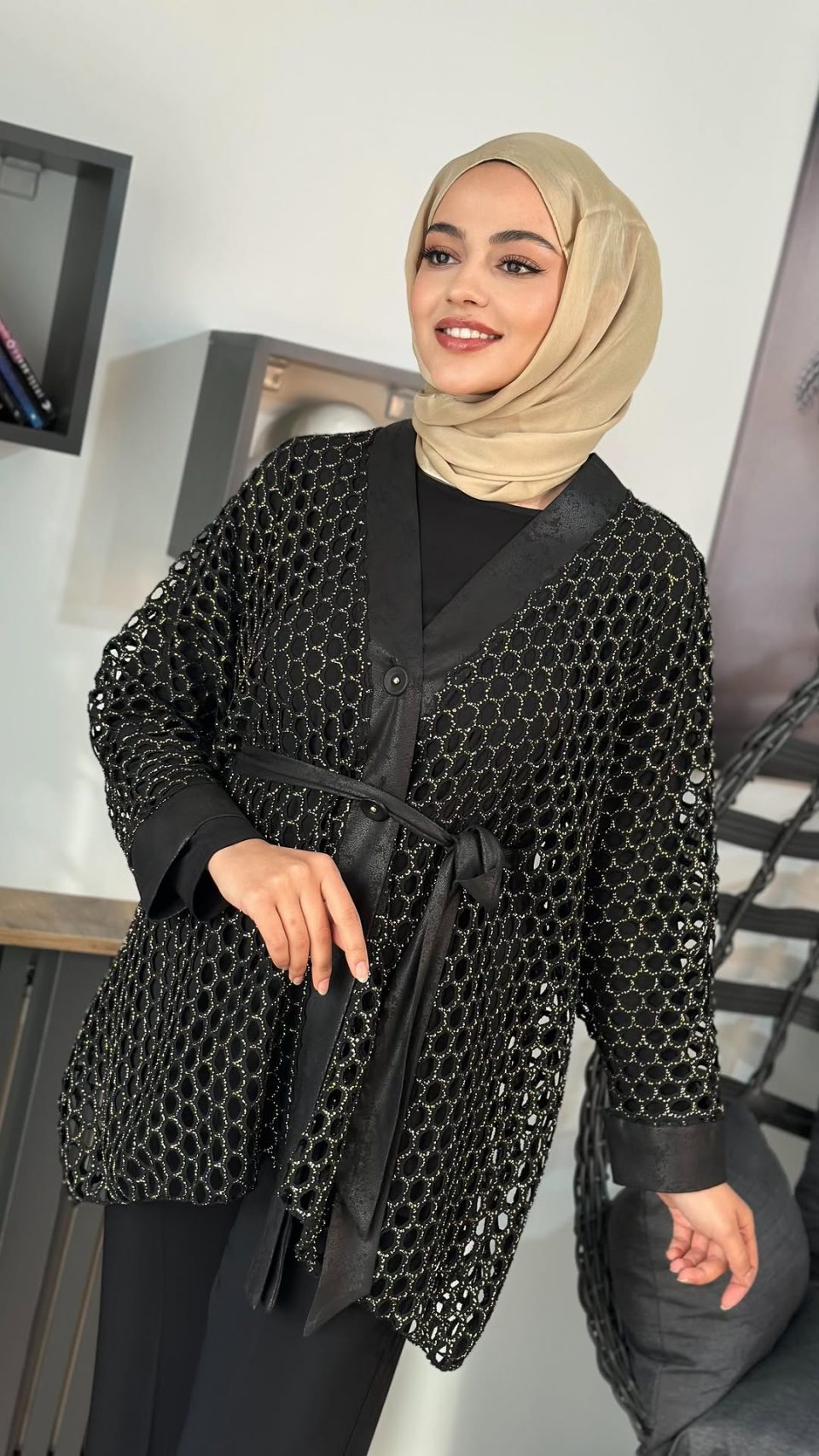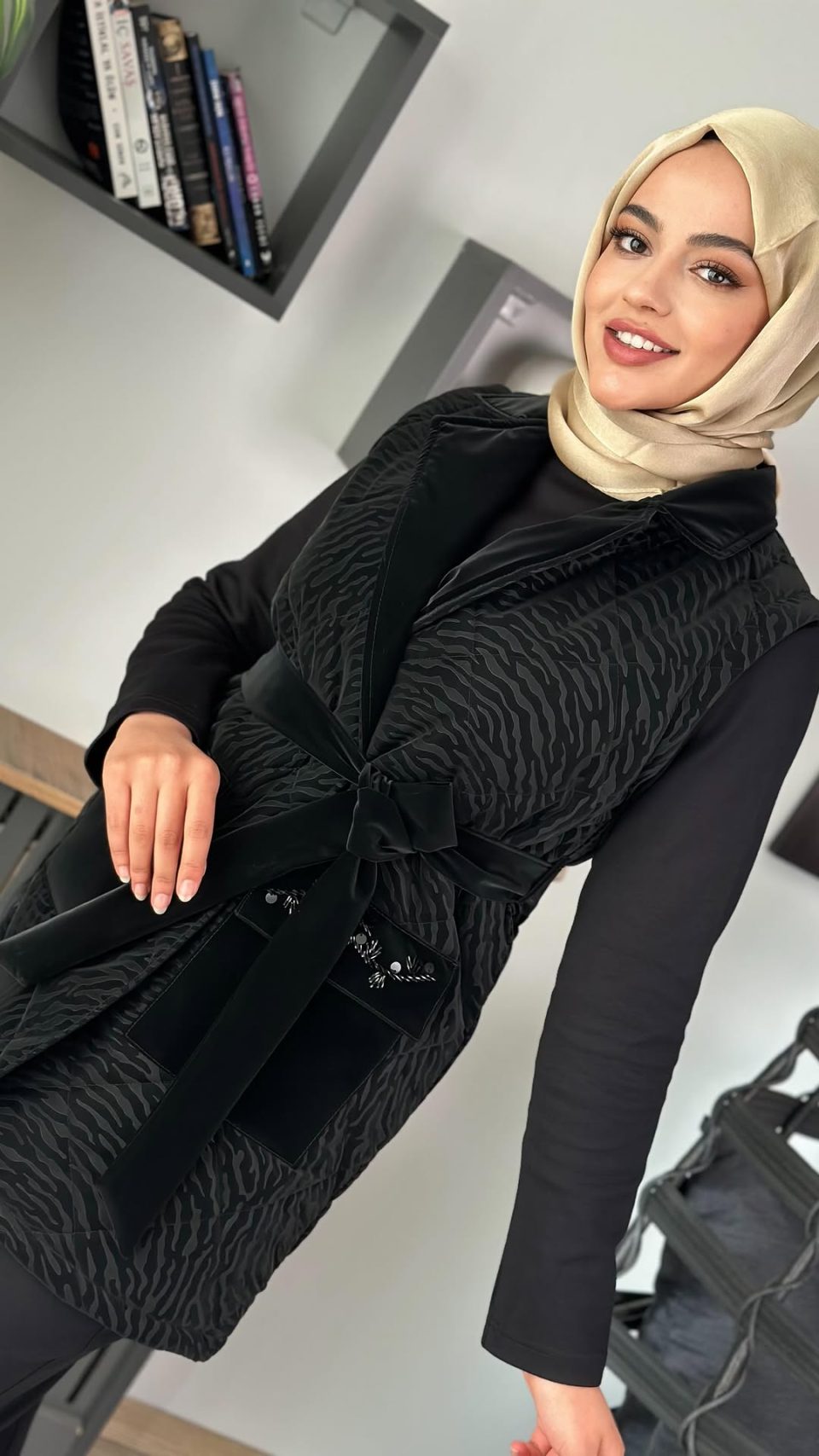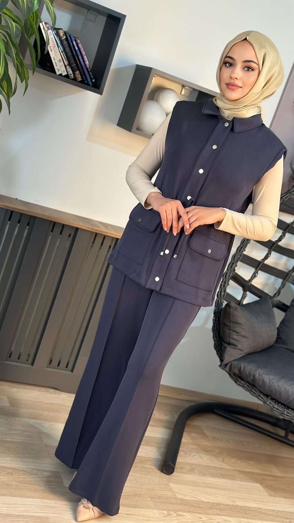 Taş Detaylı Yelekli Üçlü Takım – Bej / Siyah