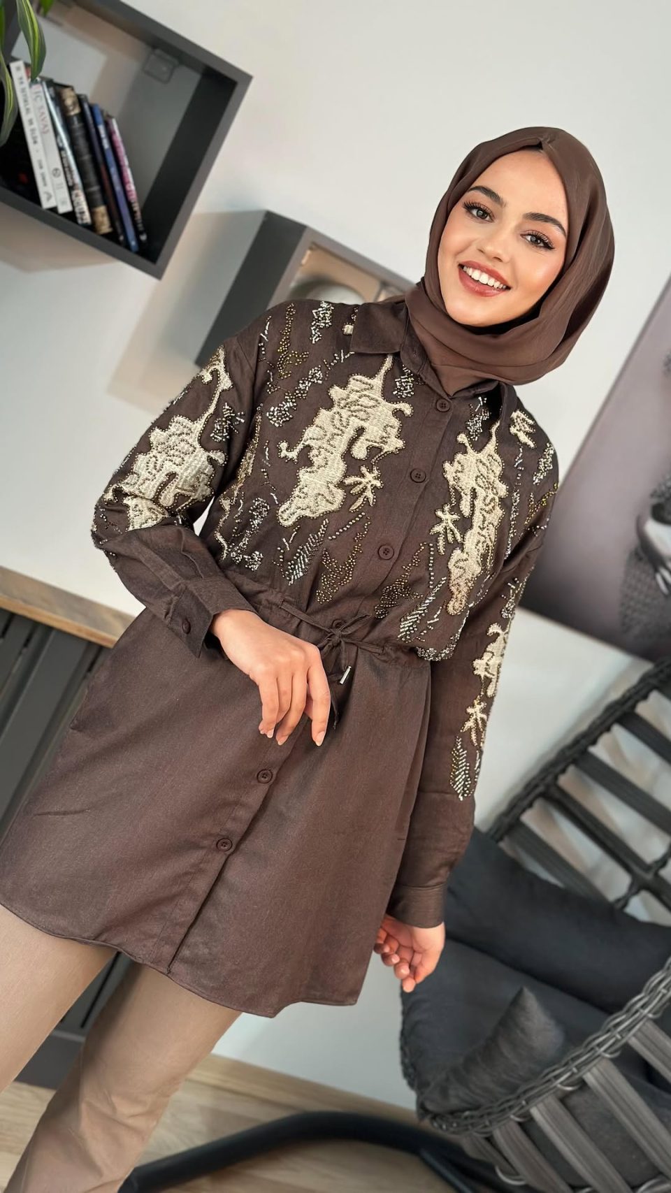 İşlemeli İnce Kaşe Kumaş Gömlek Kahve