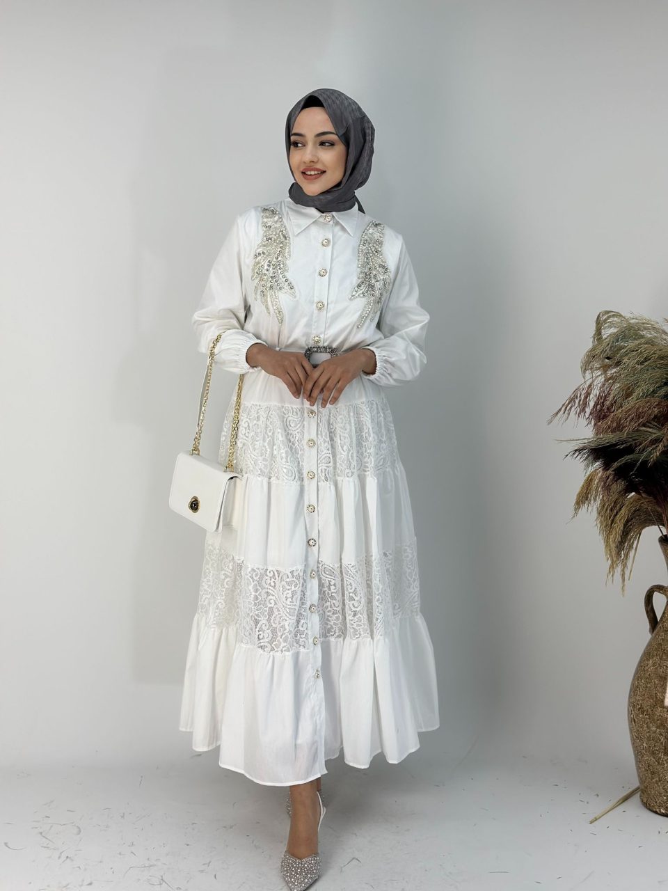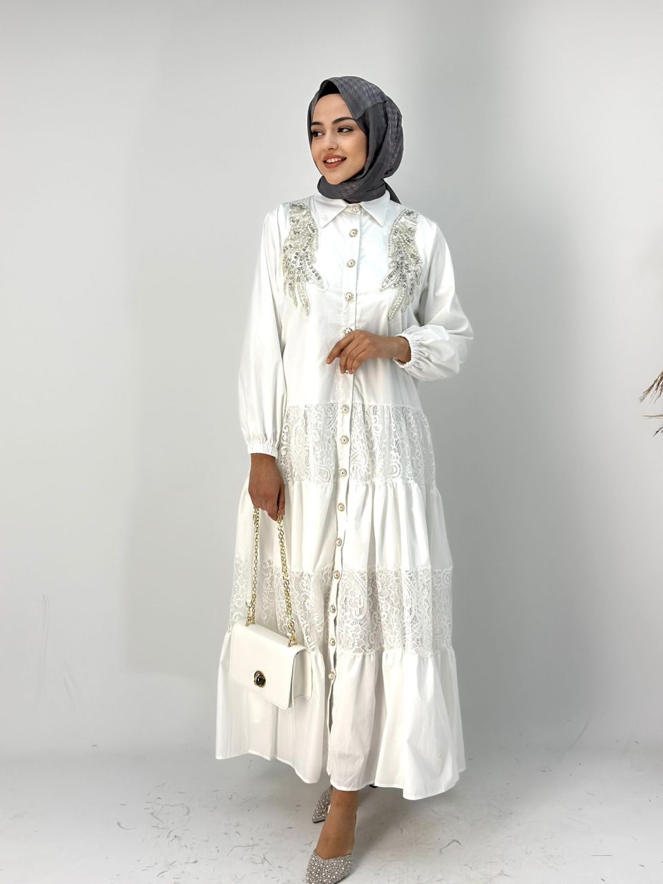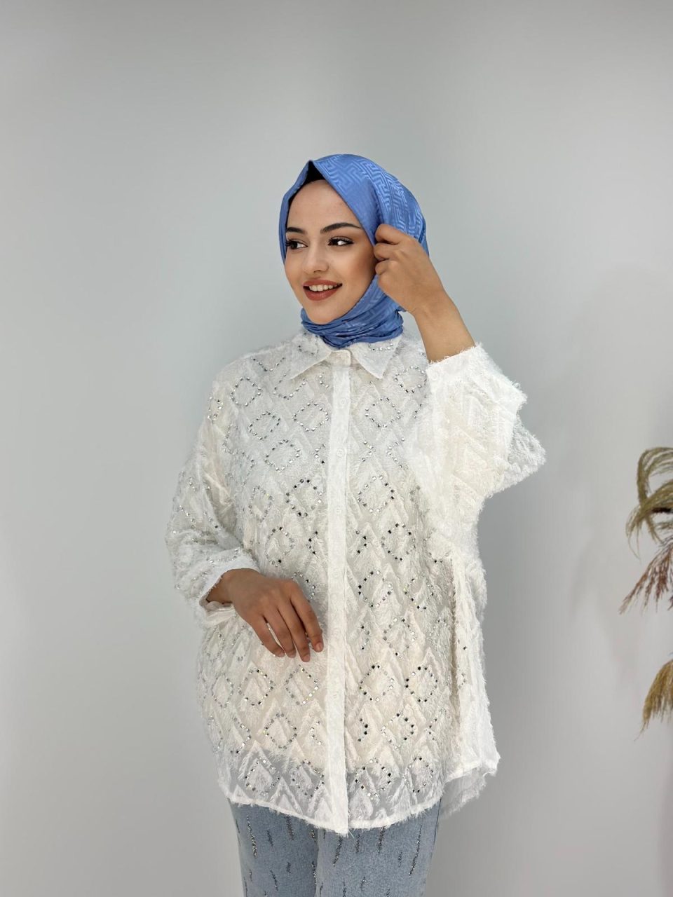 İthal Taşlı Beyaz Astarsız Gömlek