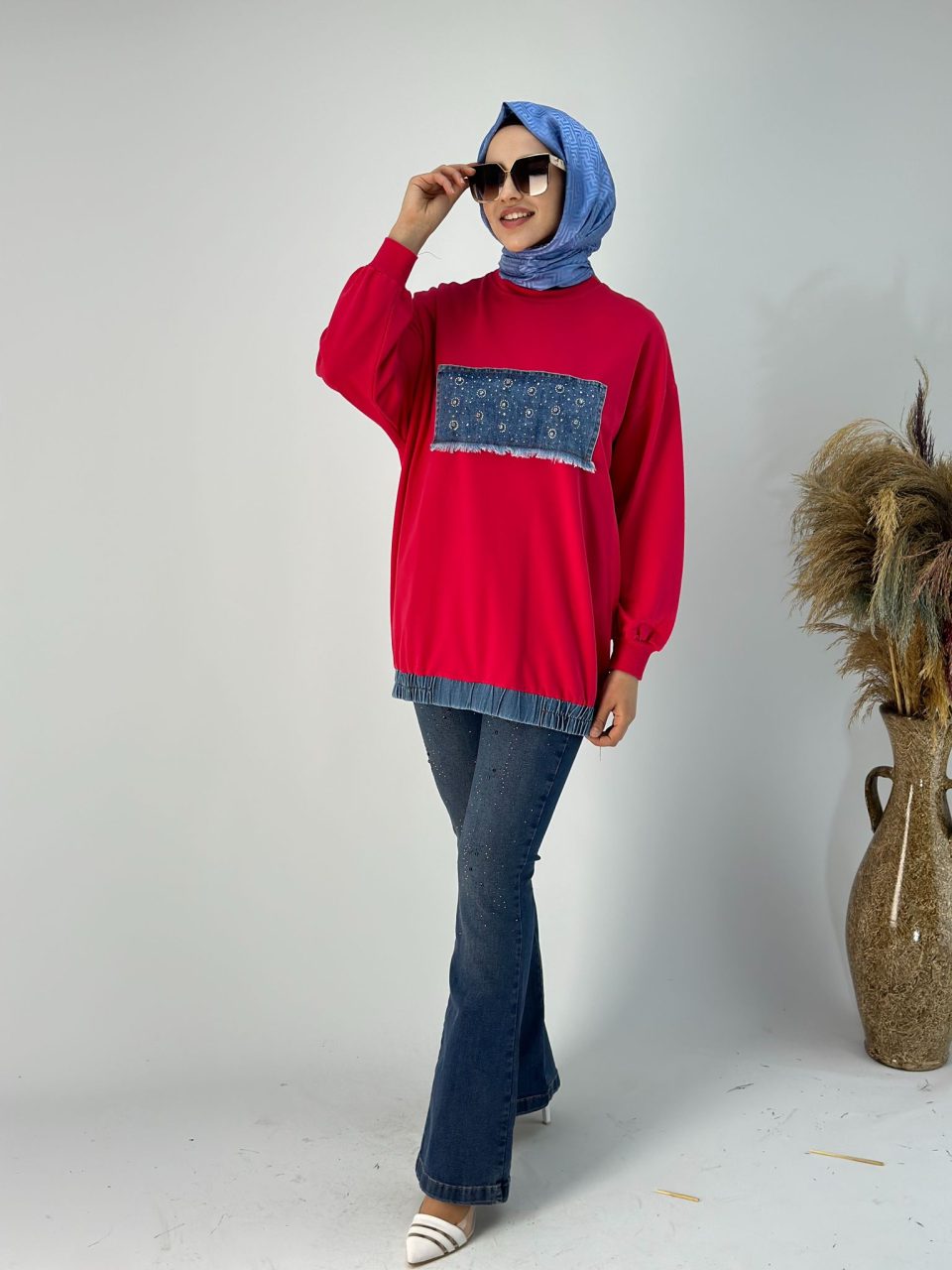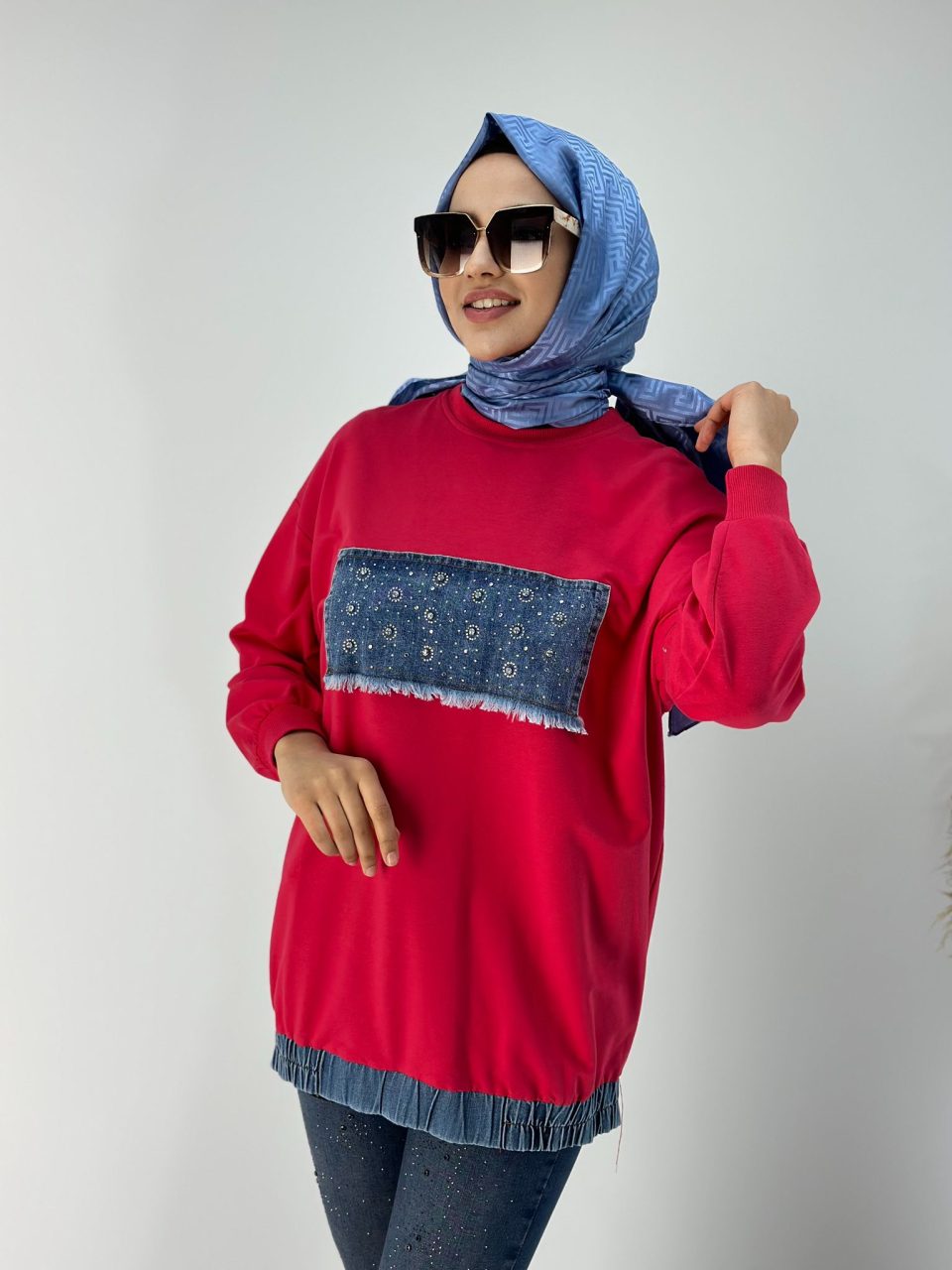 İki İplik Kot Detaylı Kırmızı Tunik
