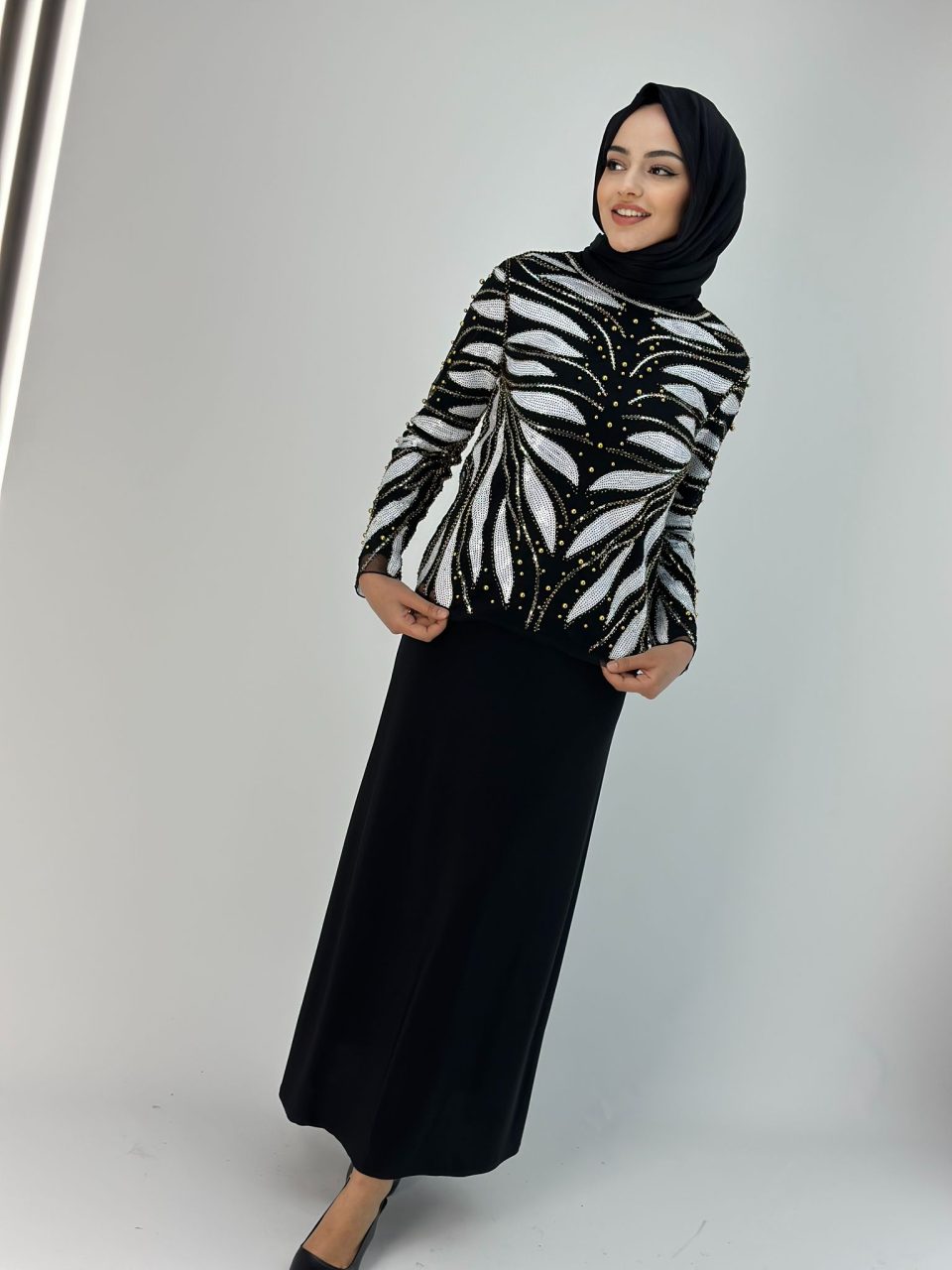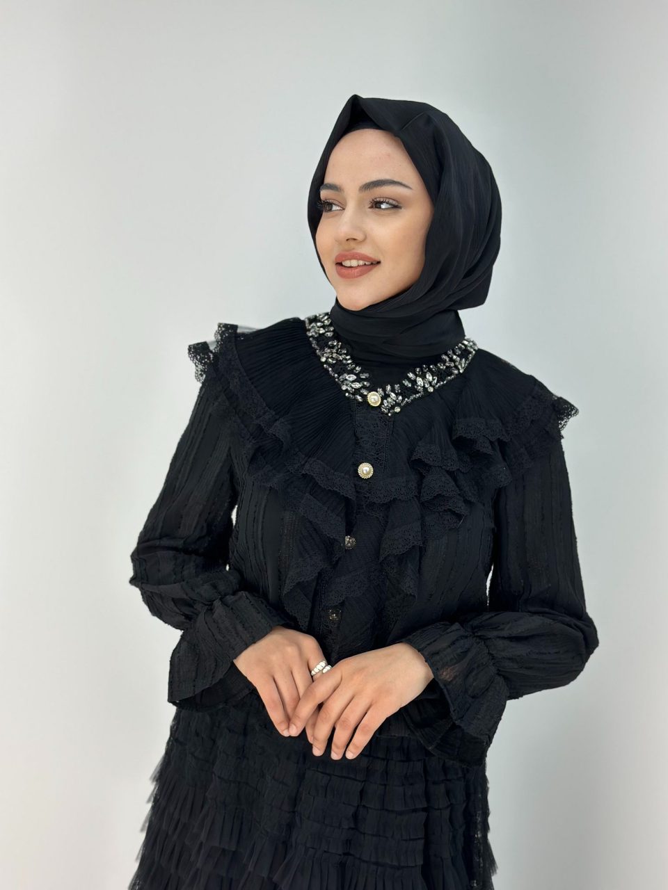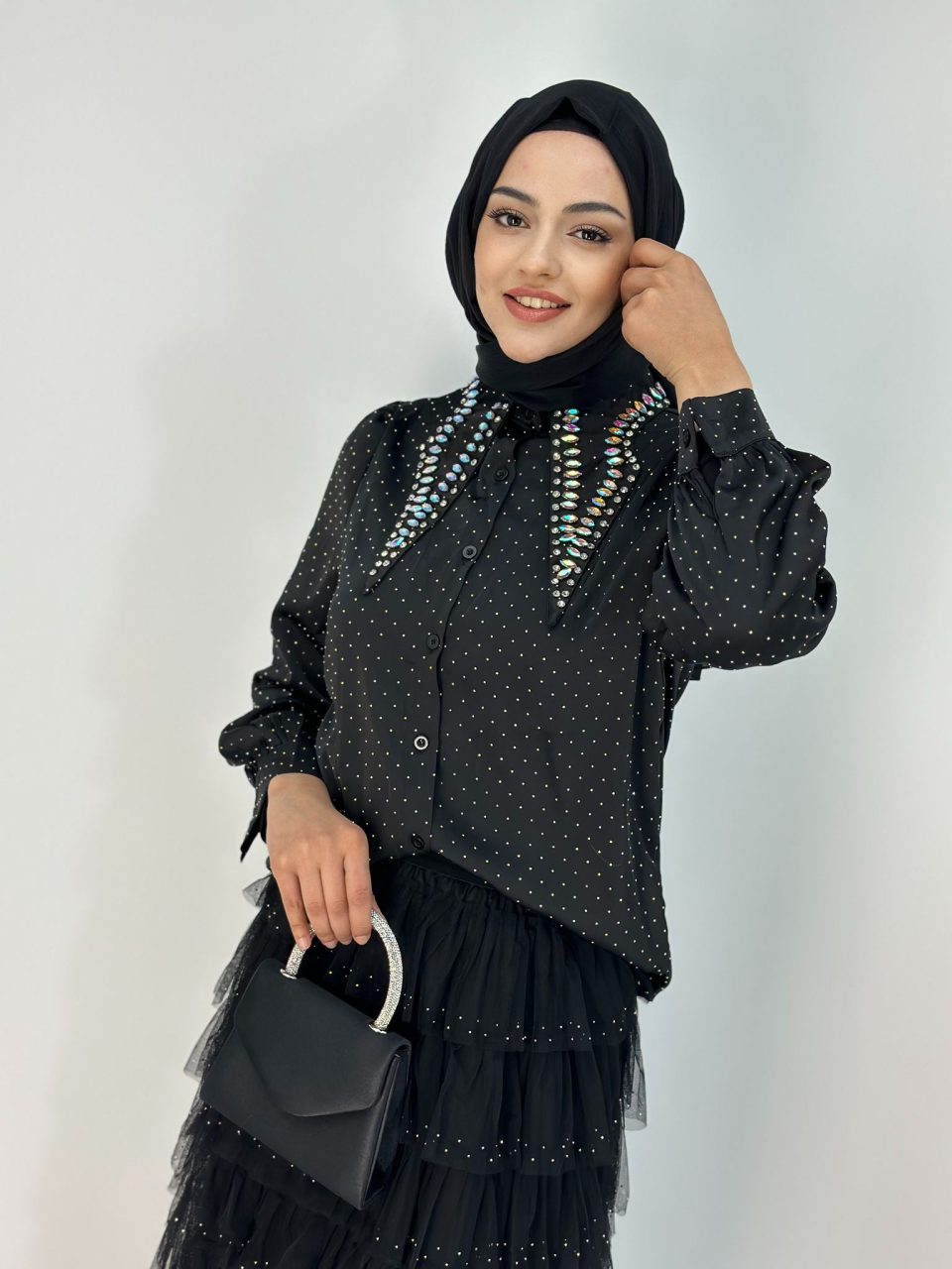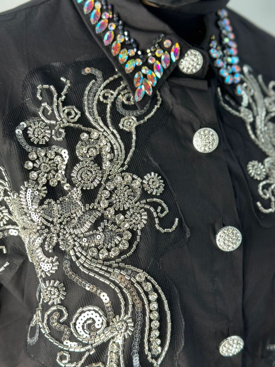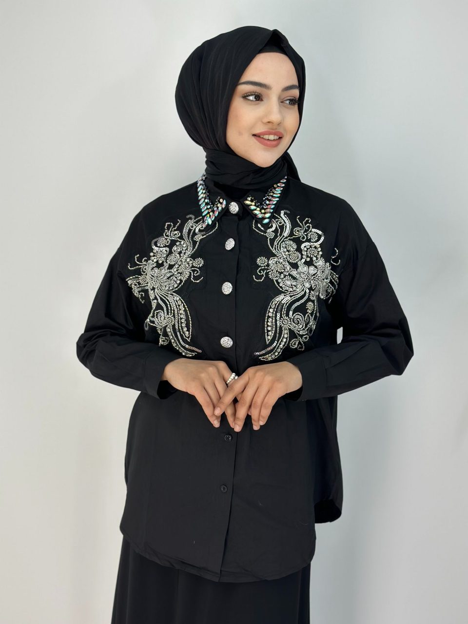 İthal Siyah Taşlı İşlemeli Gömlek