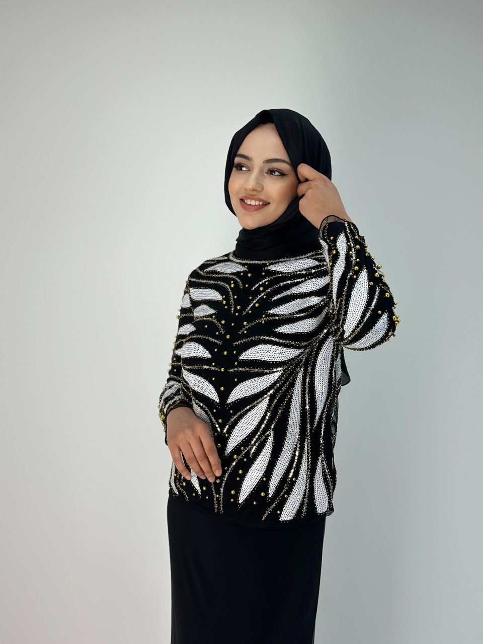 İthal Taş İşlemeli Astarsız Bluz Siyah/Beyaz