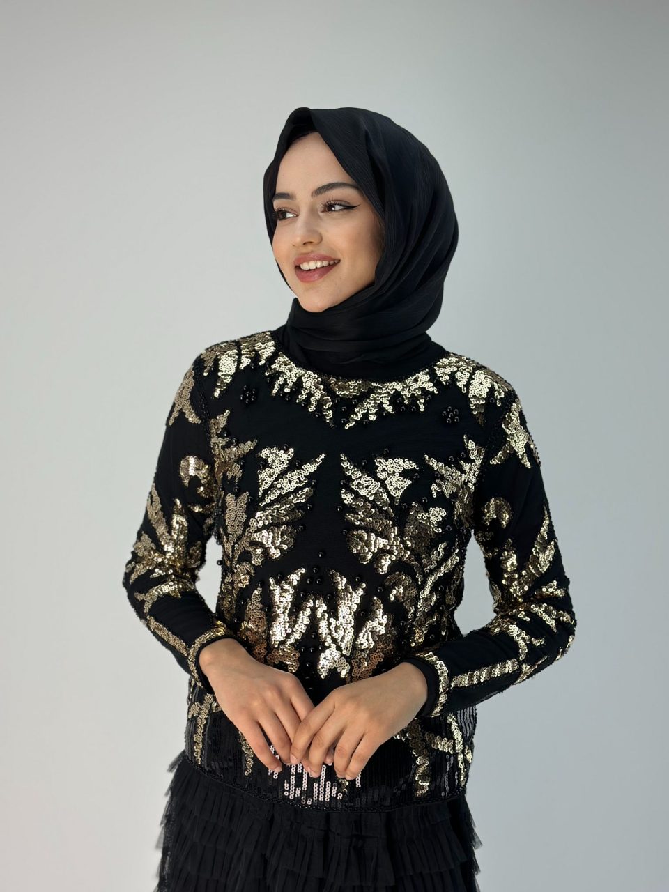 İthal Taş İşlemeli Astarsız Bluz Siyah/Dore