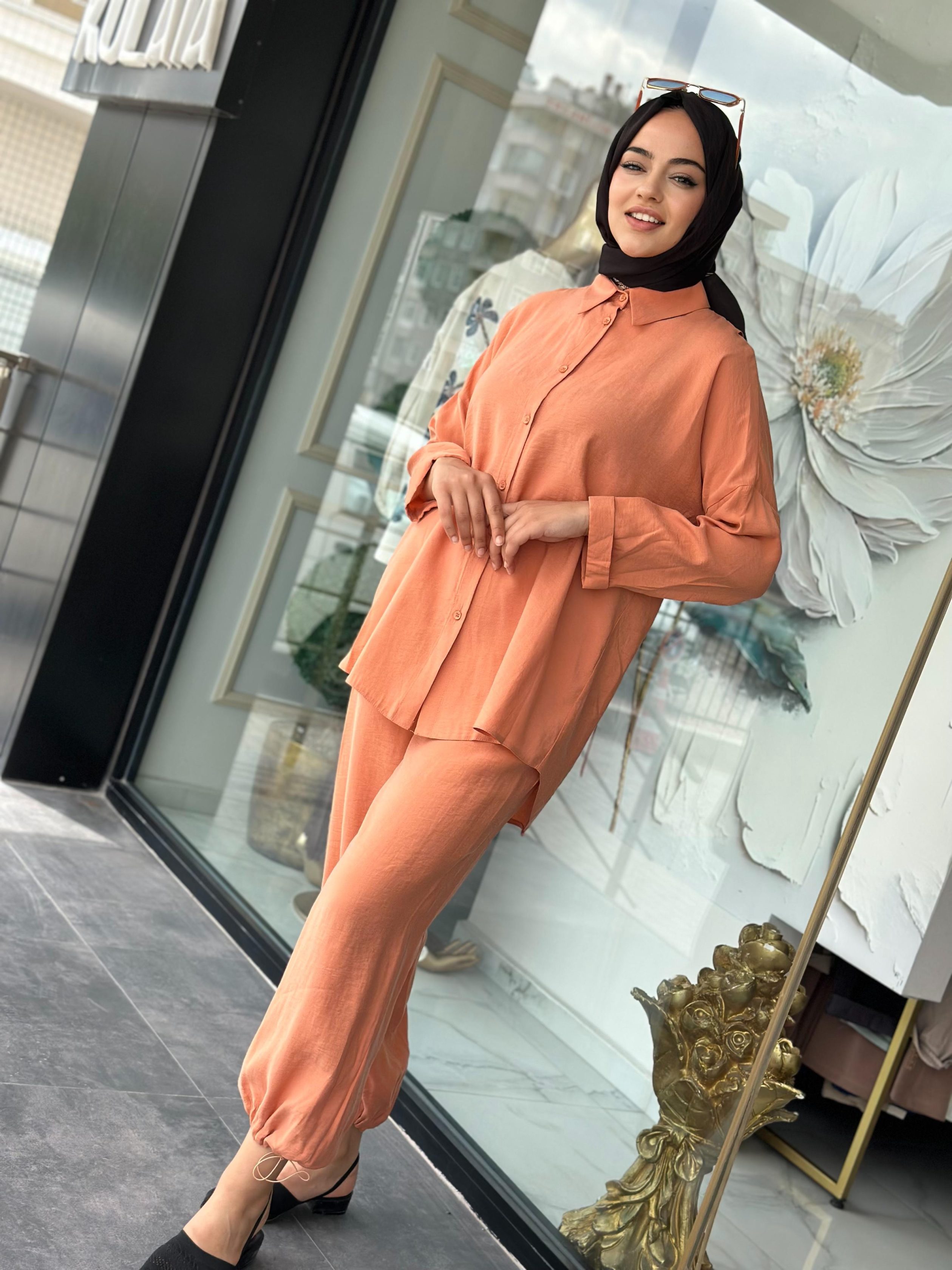 Modal Kumaş Şalvarlı Takım – Turuncu / Mint / Indigo Renkleri ve 1 Beden(38), 2 Beden(40), 3 Beden(42), 4 Beden(44) Bedenleri mevcuttur. Gömlek ön uzunluk 75cm, Arka uzunluk 85cm.