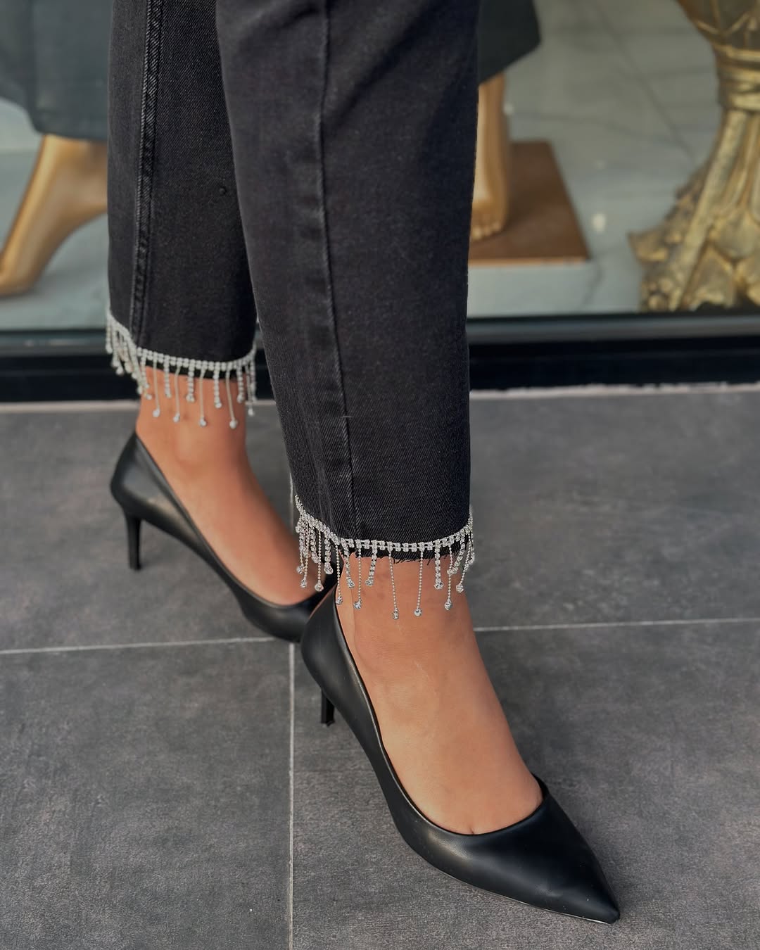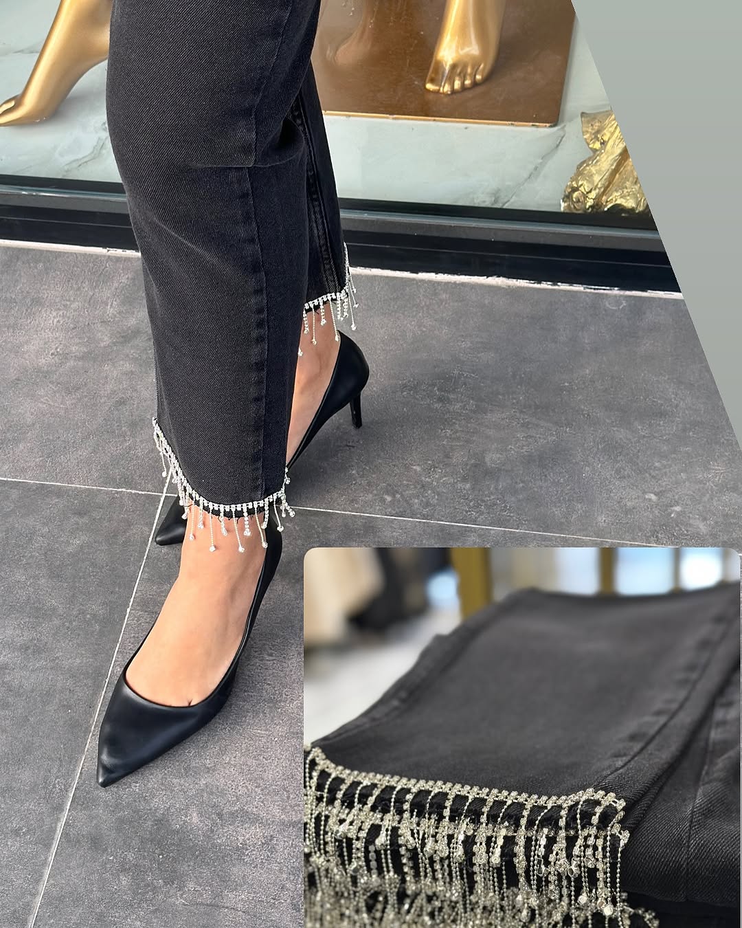Mom Taşlı Kot Jean Siyah, 28/29/30/31/32/33 bedenleri mevcuttur. 95cm uzunluğu vardır.