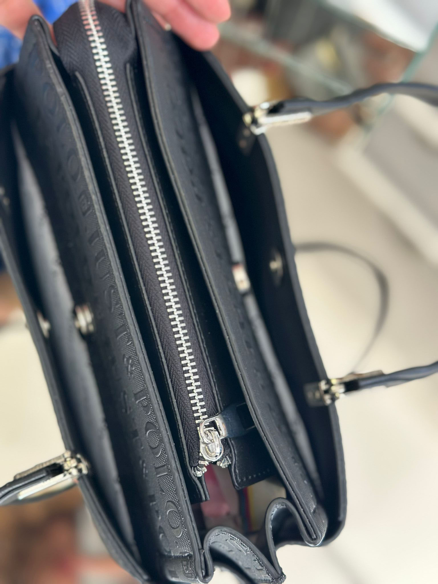 Suni deri, Üç bölmeli, fermuarlı iç cep bulunmaktadır. Omuz ve ayarlanabilir ikinci uzun askı mevcut.