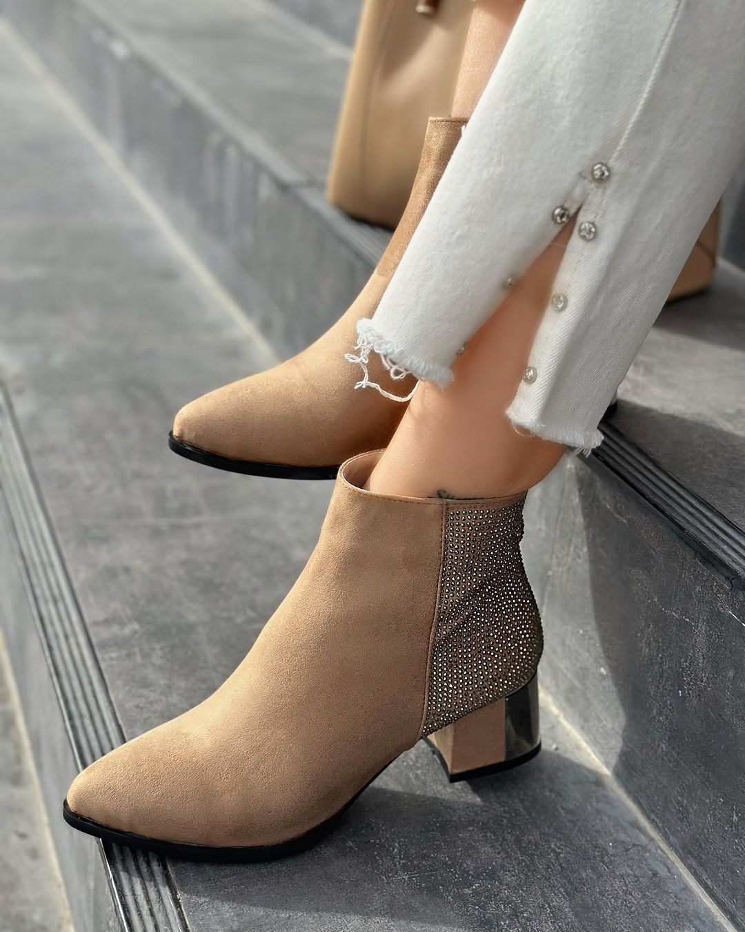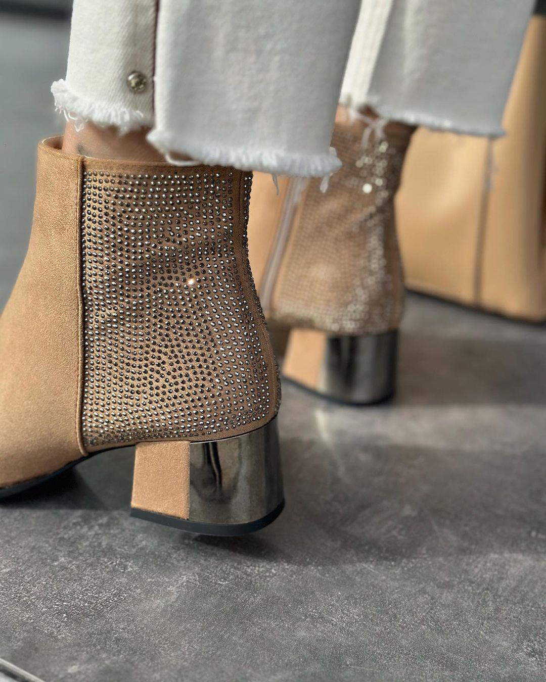 Nude Taş Detaylı Süet Bot, Aynalı 5cm Topuk Boyu, Sıcak Astar ve Yandan Fermuarlı . 36-40 numara arası.