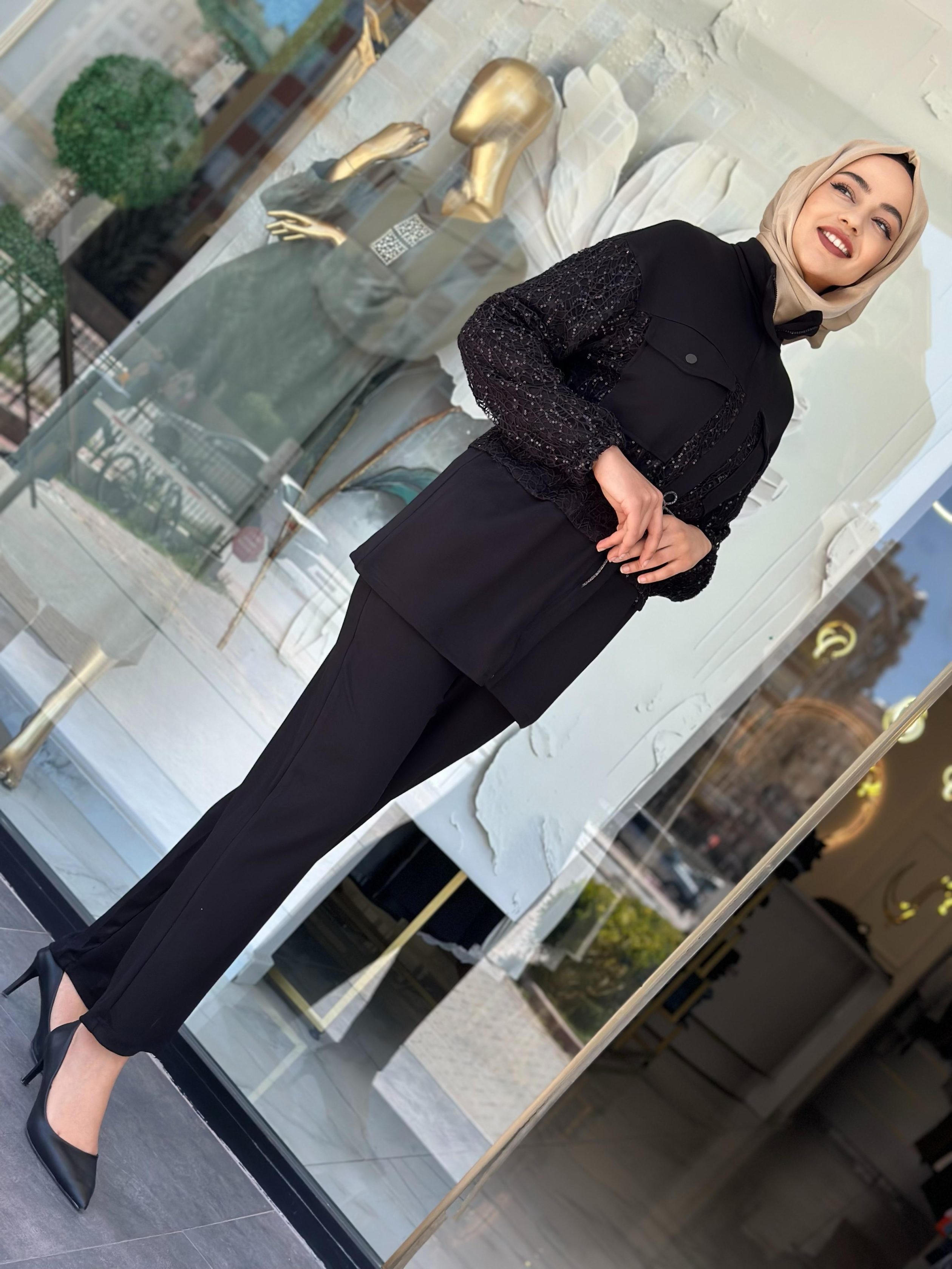 Payetli İkili Ceketli Takım Siyah, S-M(38-40) , L-XL (42-44) Bedenleri mevcuttur. 75cm Ceket Boyu vardır. Belden ayarlanabilir.