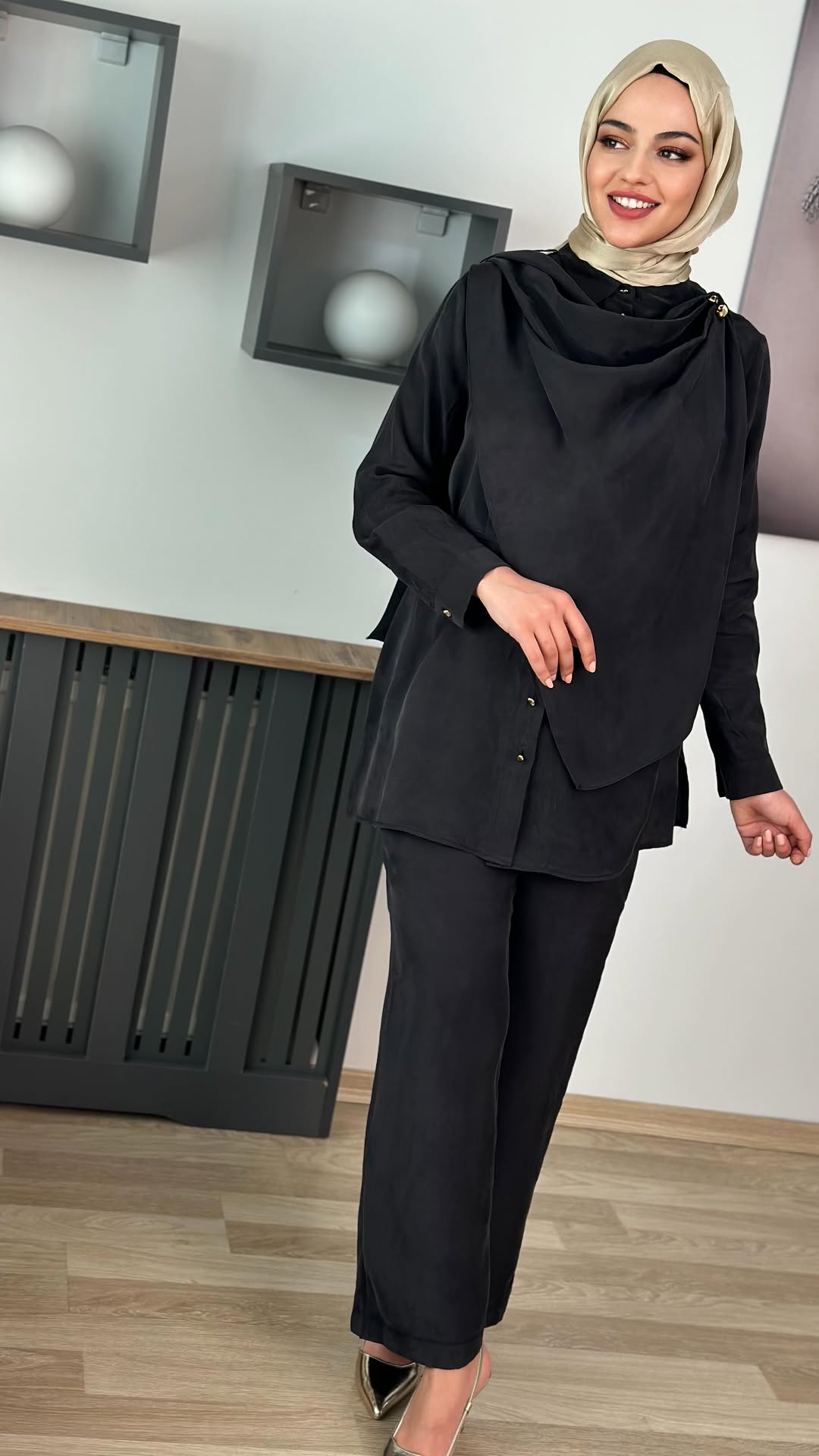 Qupra Kumaş Şal Model İkili Takım – Siyah / Haki Renkleri ve 38/40/42/44 Bedenleri mevcuttur. 83cm Gömlek Boyu olup, Pantolon Beli Yarı Lastiklidir.
