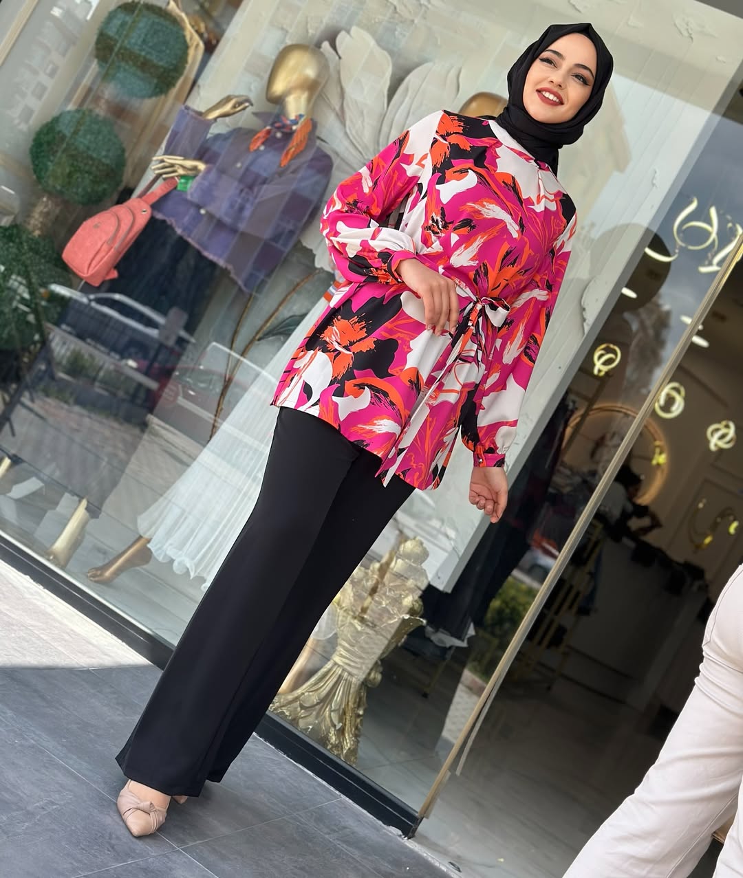 Şifon Renkli Desenli İkili Takım Pembe, 38/40/42/44 Bedenleri mevcuttur. 80cm Tunik boyu vardır. Pantolon astarlıdır.