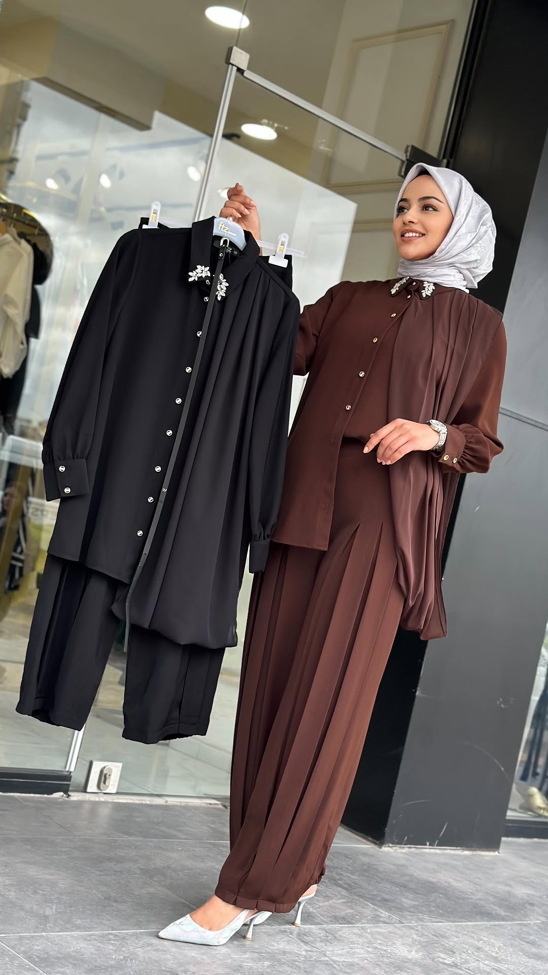 Şifon Şal Detaylı Taş İşlemeli İkili Takım – Siyah / Kahve Renkleri ve 38/40/42/44 Bedenleri mevcuttur. Pantolon Şalvar Kesim Olup Pilelidir.