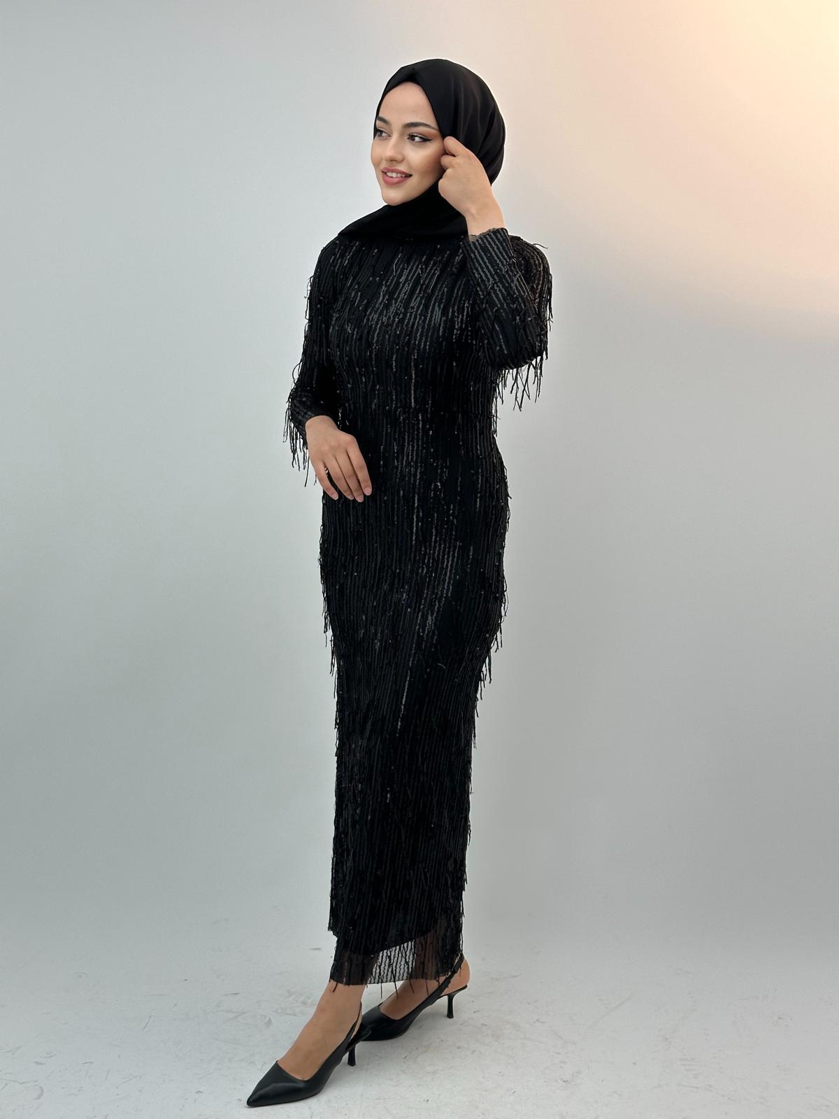 Siyah Payetli Püsküllü Abiye, 36/38/40/42 Bedenleri mevcuttur. 135cm Boy uzunluğu vardır.