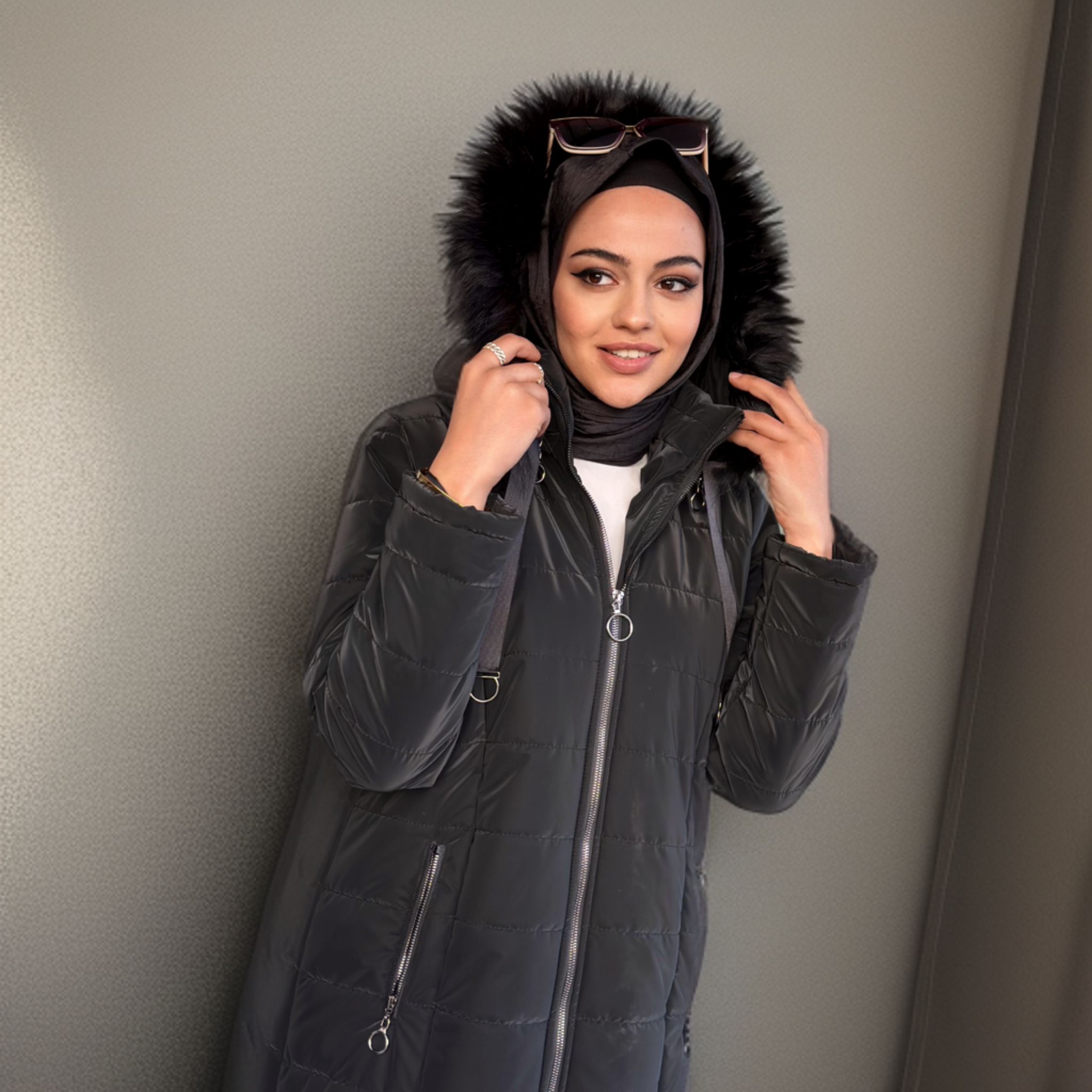 Siyah Şişme Mont Kürklü, 38/40/42/44/46 bedenleri mevcuttur, 100cm boyu uzunluğu, çıkarılabilir kapüşon.