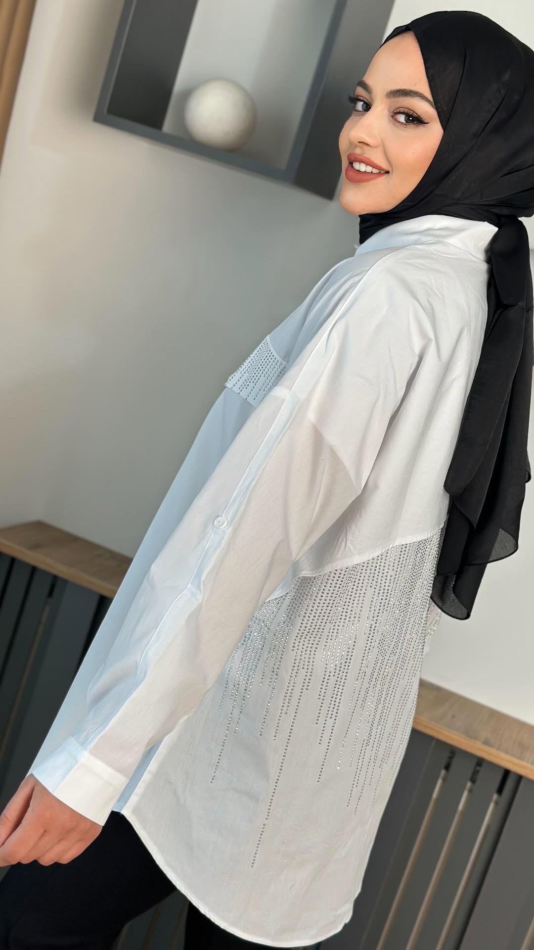 Tasarım Damla Taş Gömlek – Siyah / Beyaz Renkleri ve S-M(38/40/42), L-XL(44/46) Bedenleri mevcuttur. 75cm Boy uzunluğu vardır.