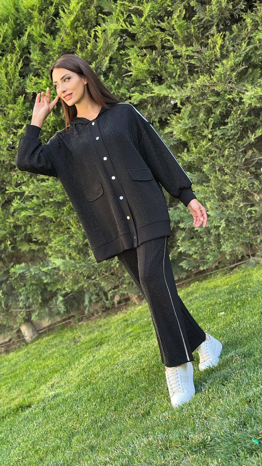 Taşlı Oysho Kumaş İkili Takım Siyah, 36/38/40/42 Bedenleri mevcuttur. Çıtçıtlı Ceket Boyu 75cm.