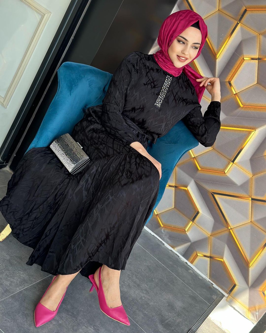 Jakar Saten Siyah Elbise, 36/38/40/42/44 Bedenleri mevcuttur, 140cm boy uzunluğu vardır.