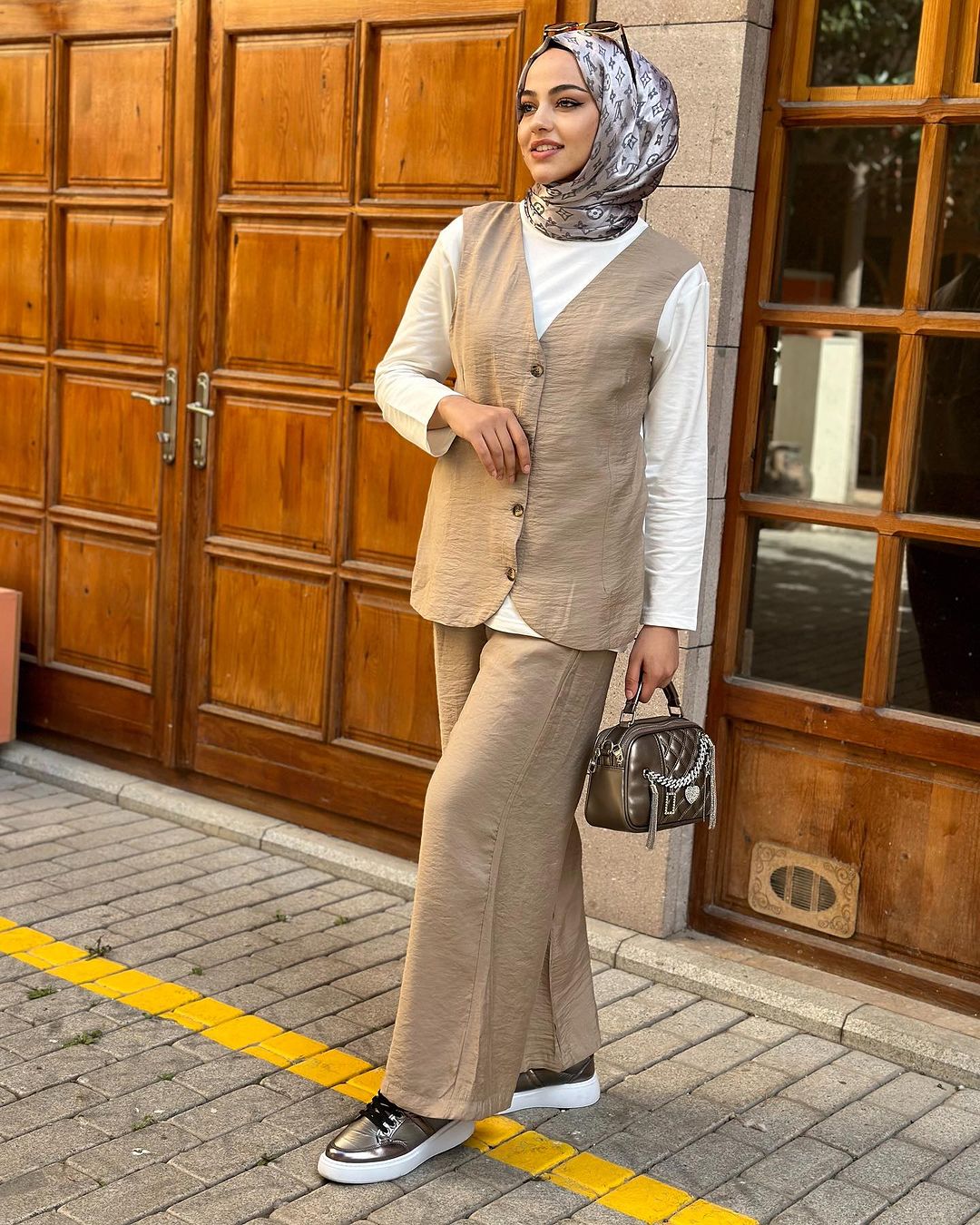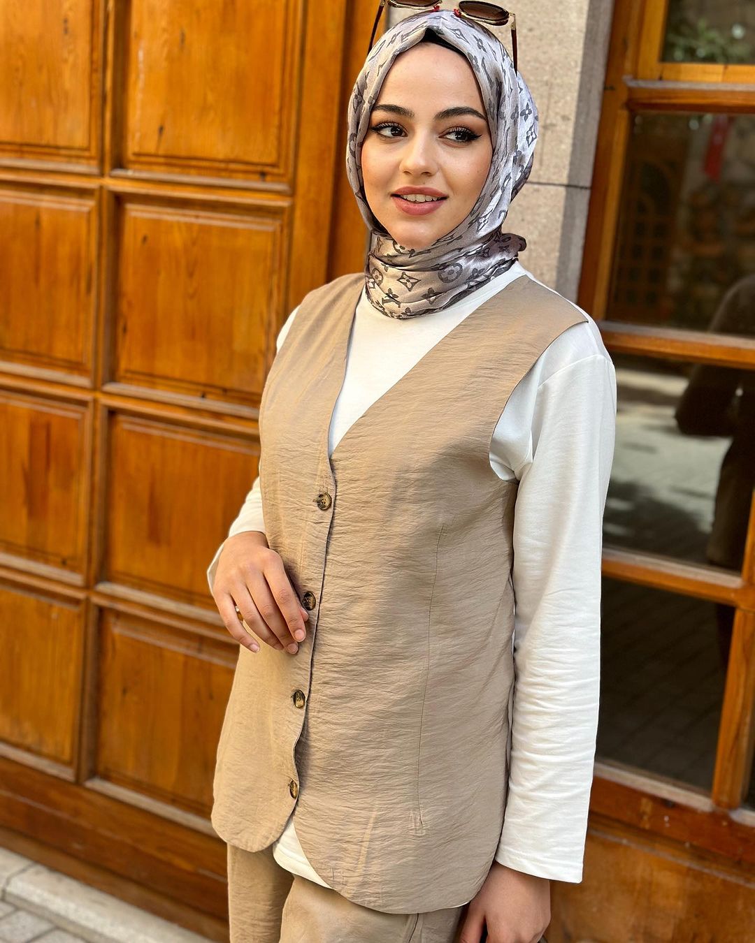 Yelekli Sweat İkili Takım Bej, 38/40/42/44 bedenleri mevcuttur, Yelek Sweat Boyu 80cm uzunluğundadır, Pantolon Beli Lastiklidir. (Yelek ve Sweat Birleşiktir.)
