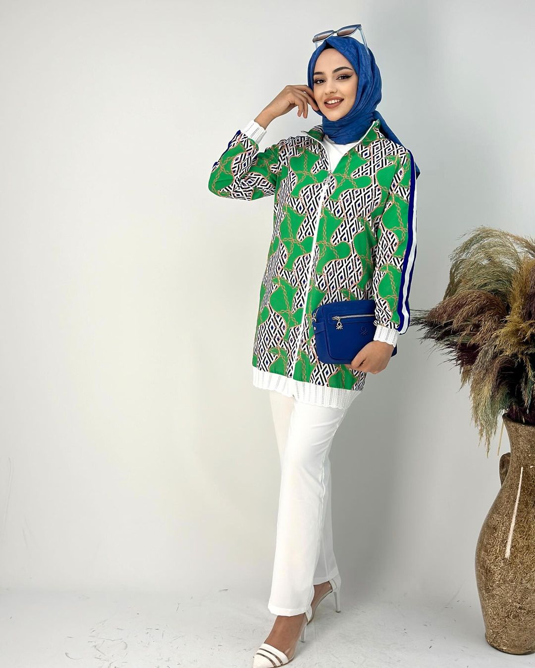Yeşil Desenli İkili Takım, 38/40/42/44 Bedenleri mevcuttur. Ceket Boyu 90cm, Beli Lastikli Pantolon 100cm boy uzunluğu mevcuttur. Tam astardır.