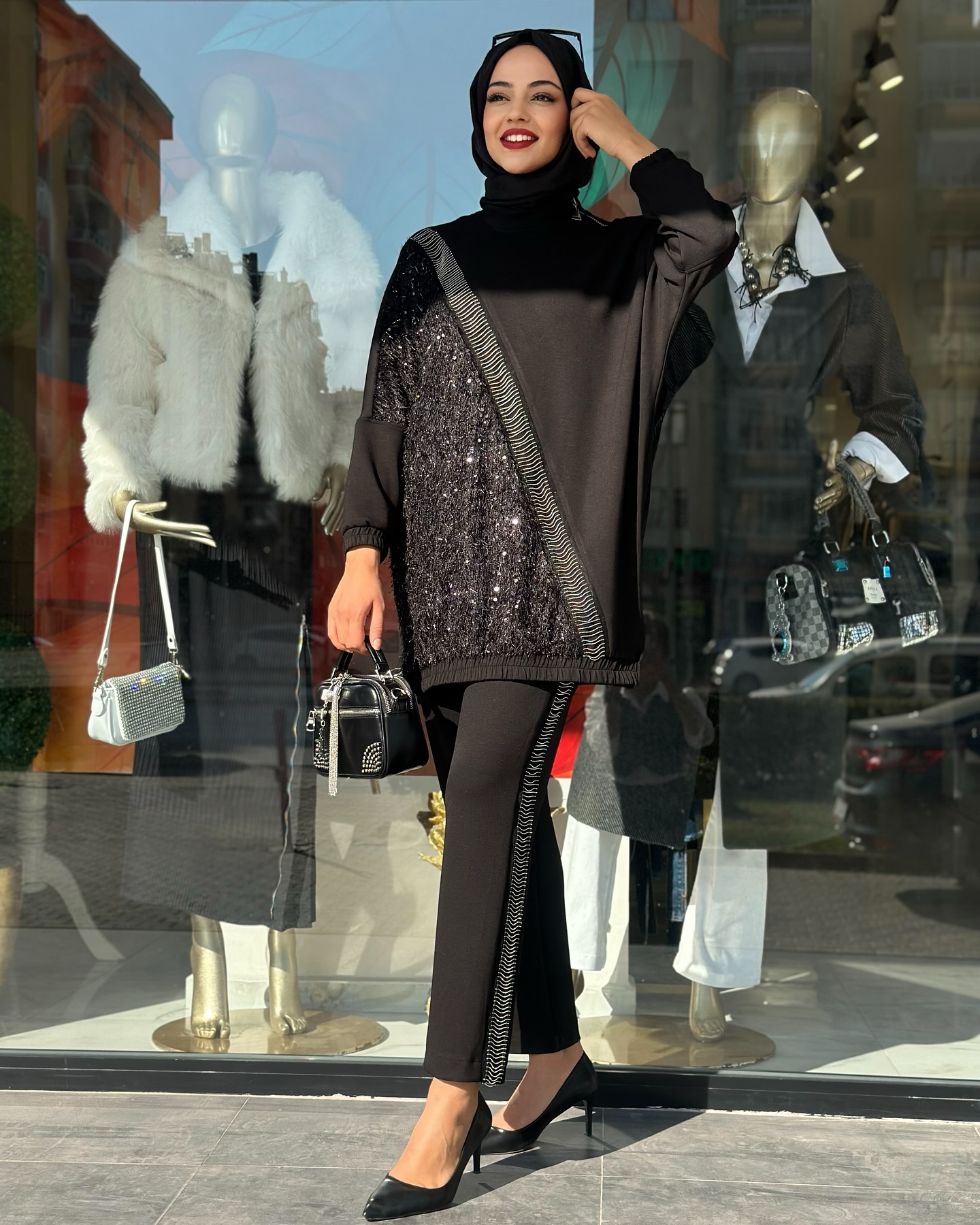 Zincir Detaylı İkili Takım Siyah, 1 Beden(38-40), 2 Beden(42-44) bedenleri mevcuttur. 85cm tunik boy uzunluğu vardır.